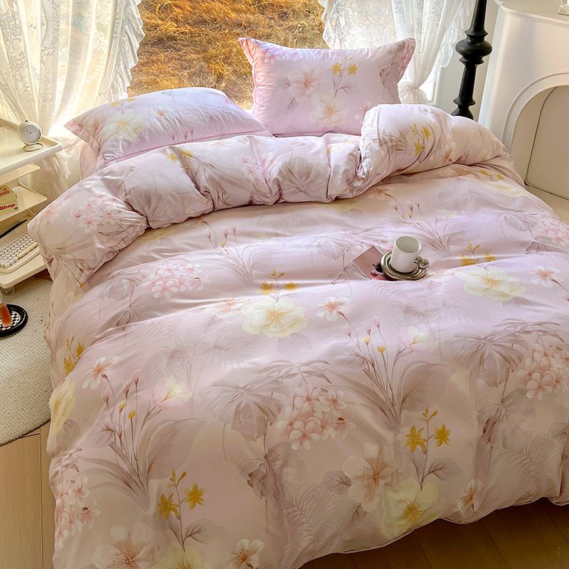 耀悦家纺 2025新款水洗真丝四件套简约印花小清新欧式ins新中式冰丝四件套 粉墨丹青