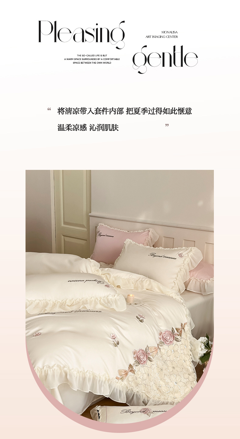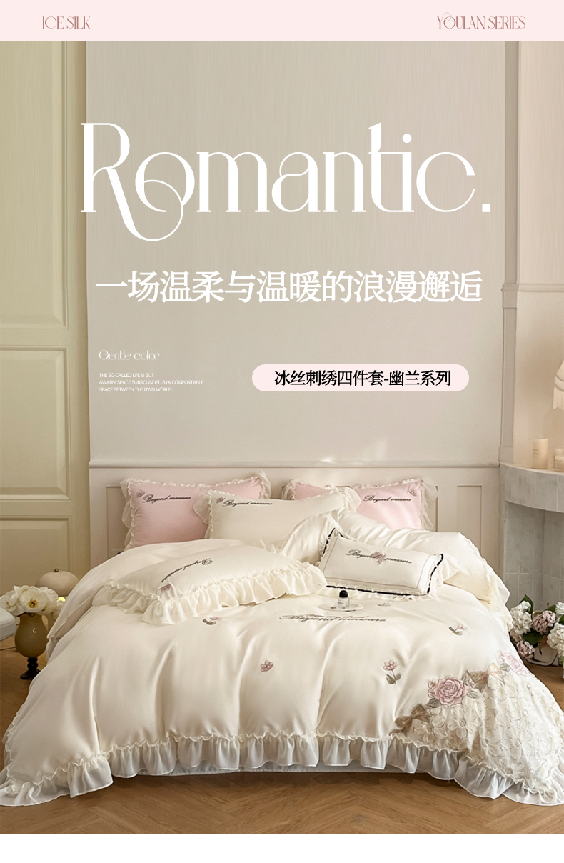(总)七七家纺 2025新款冰丝刺绣款四件套幽兰系列,幽兰白,幽兰粉,幽兰灰,幽兰蓝,幽兰紫