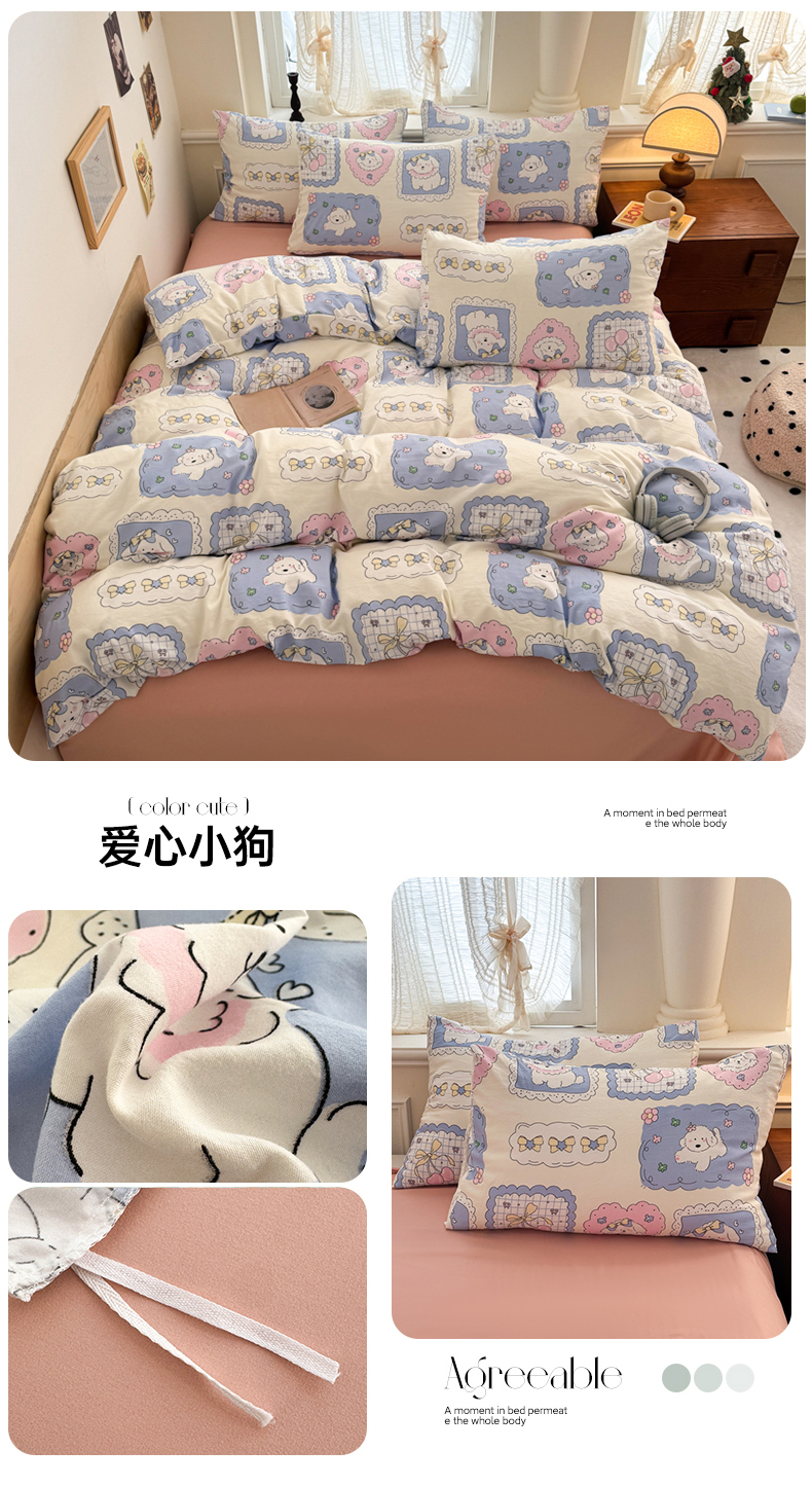 当前位置: 91家纺网 > 商品网购 > 床品套件 > 四件套 > 化纤普通四件套 > 晚爱家纺2025新款ins风卡通小清新超柔裸睡水洗棉四件套学生宿舍三件套 爱心小狗