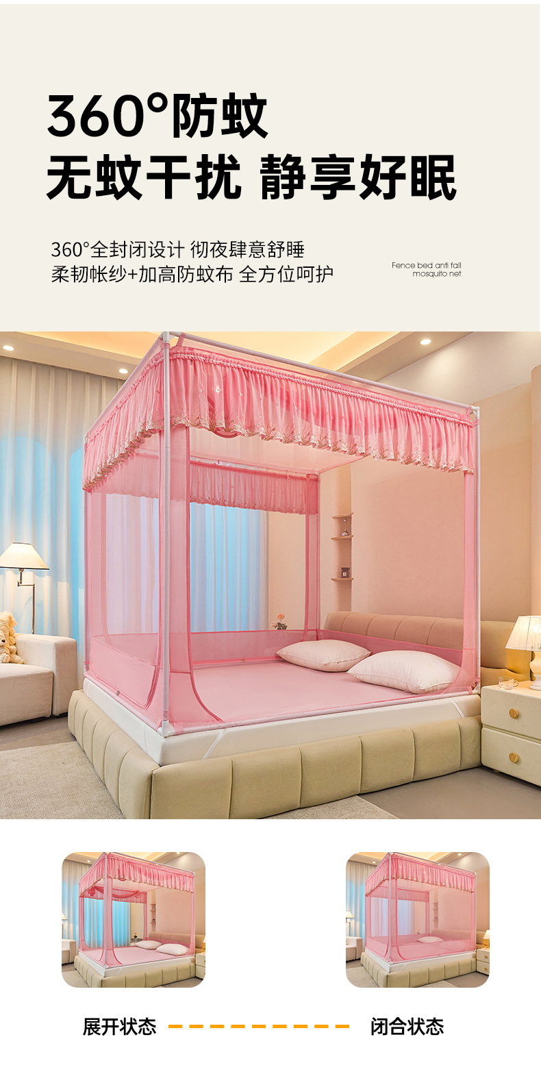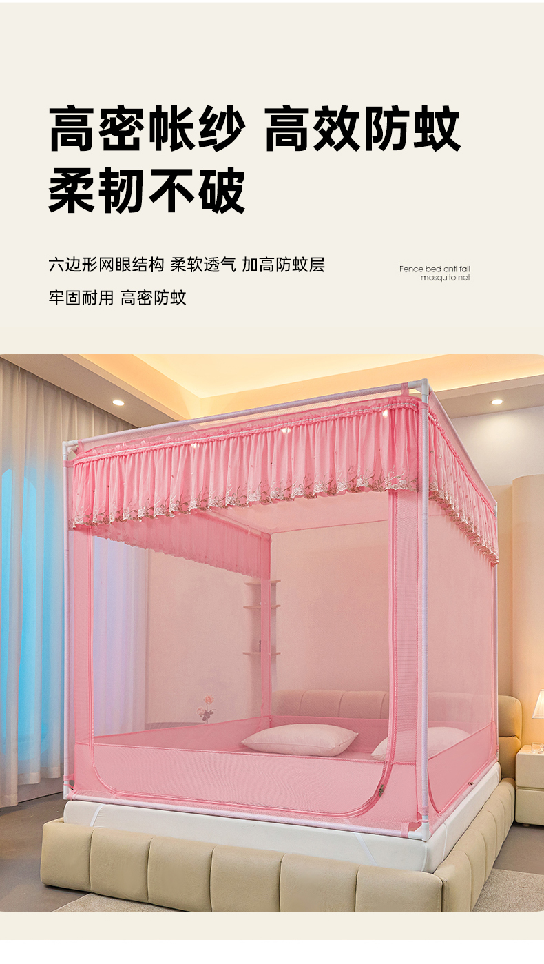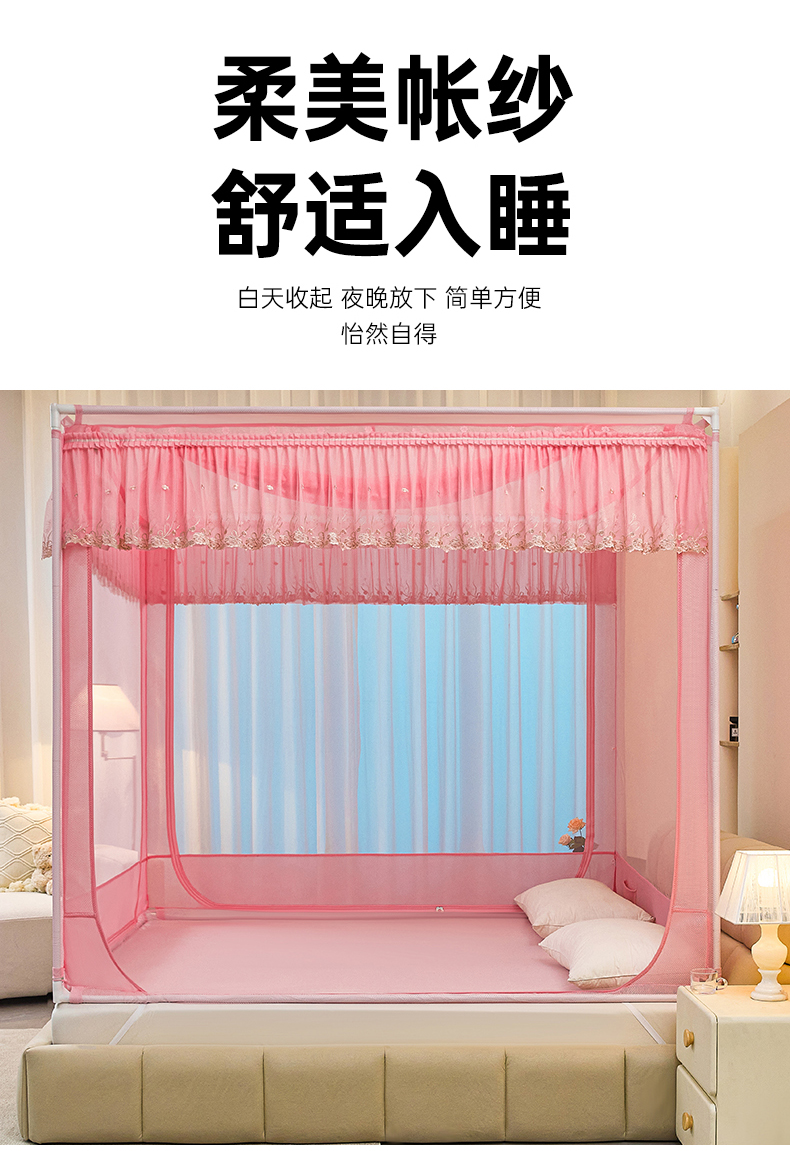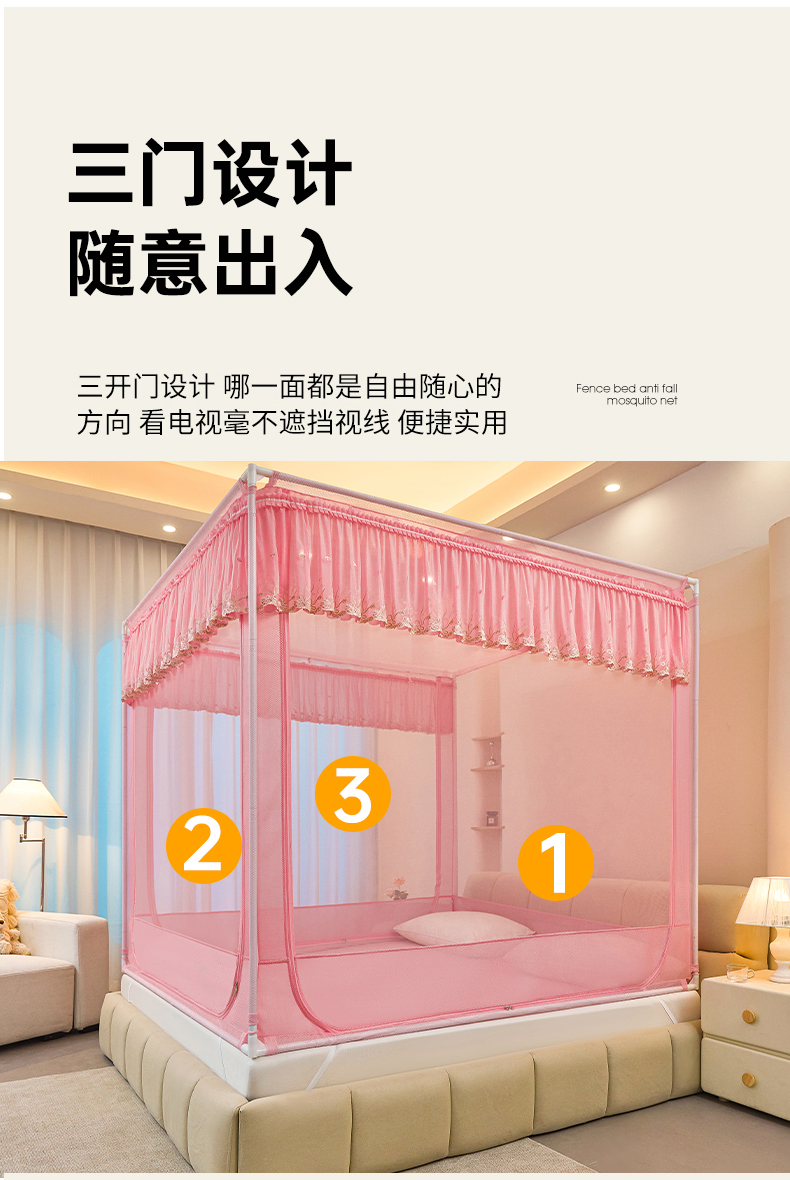 (总)2025新款双层花边全包围床笠款三开门蚊帐-幽梦星辰,奶黄,藕玉,颜淡蓝