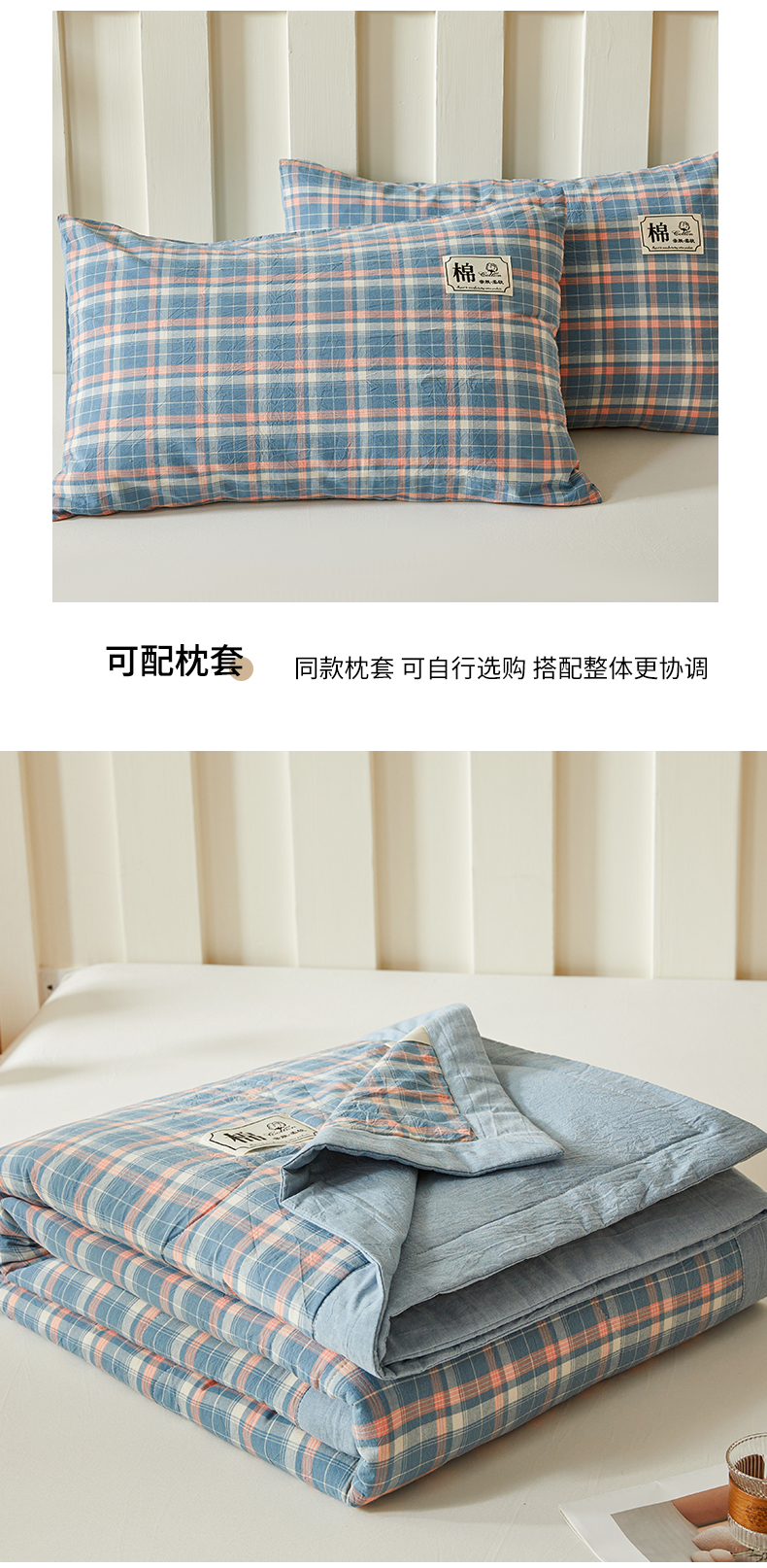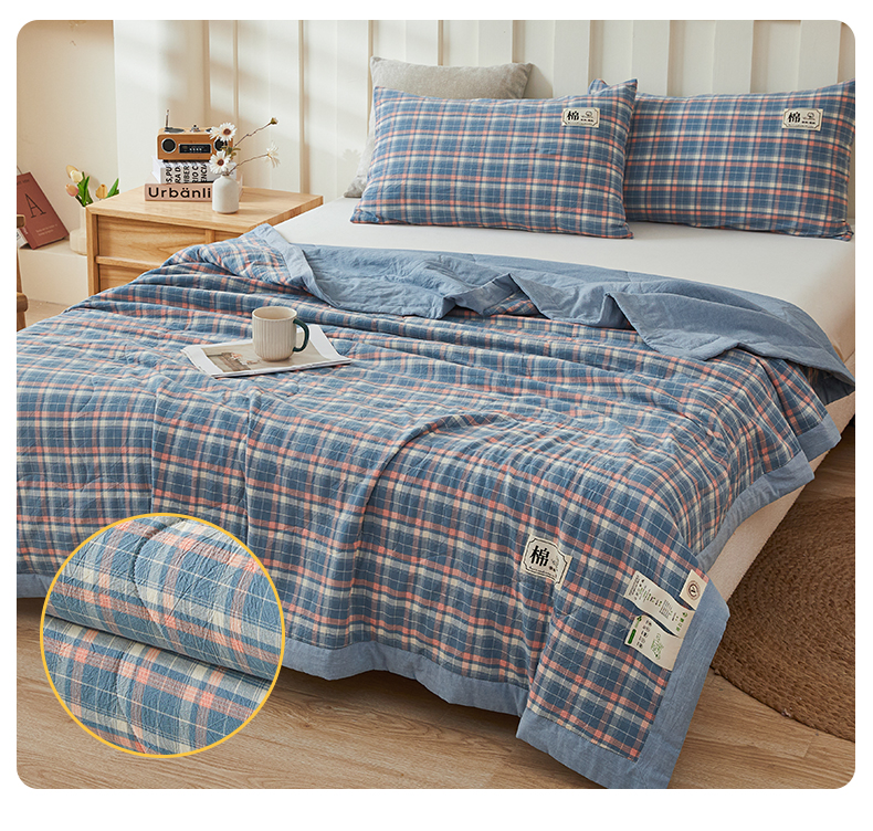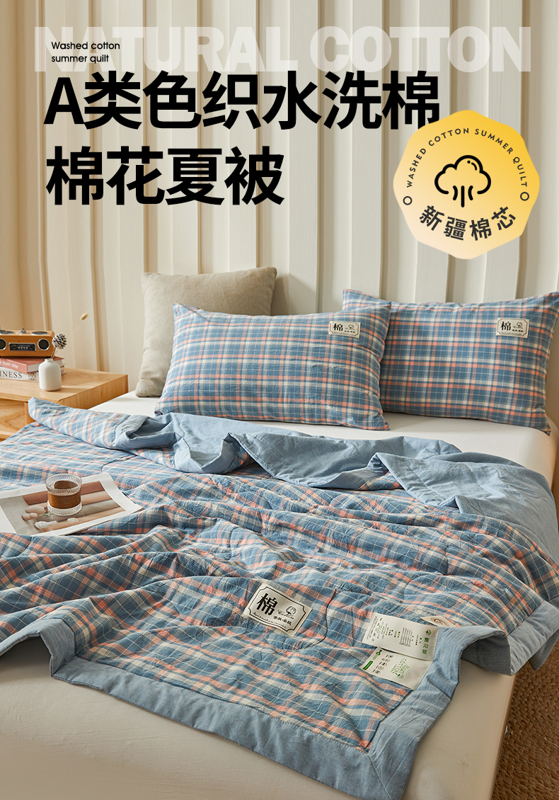 招财星家纺 2025新款A类色织水洗棉夏被新疆棉花被空调被夏凉被 格韵 蓝粉