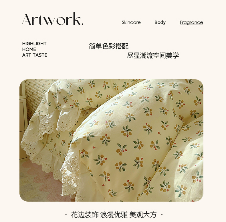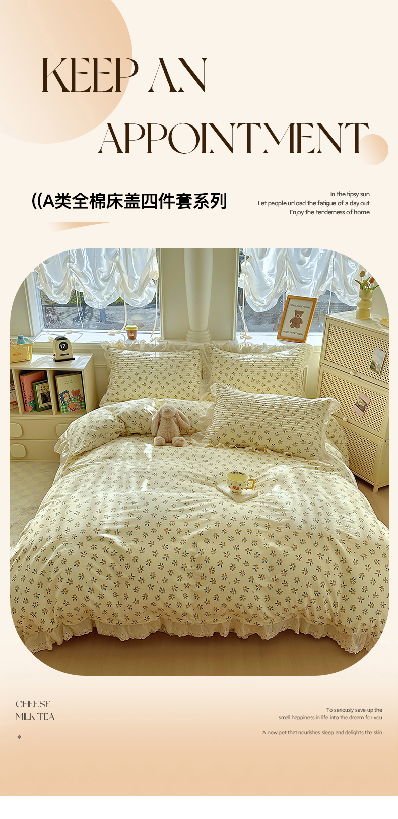 (总)美梦家纺 2026新款高克重全棉花边云感棉床盖四件套,希雅莉·米,雅格·粉,樱桃蜜·咖,尤丽叶·咖,紫藤碎花·咖,莓莓素语·粉,暖小象·兰,浅叶·米,希雅莉·灰
