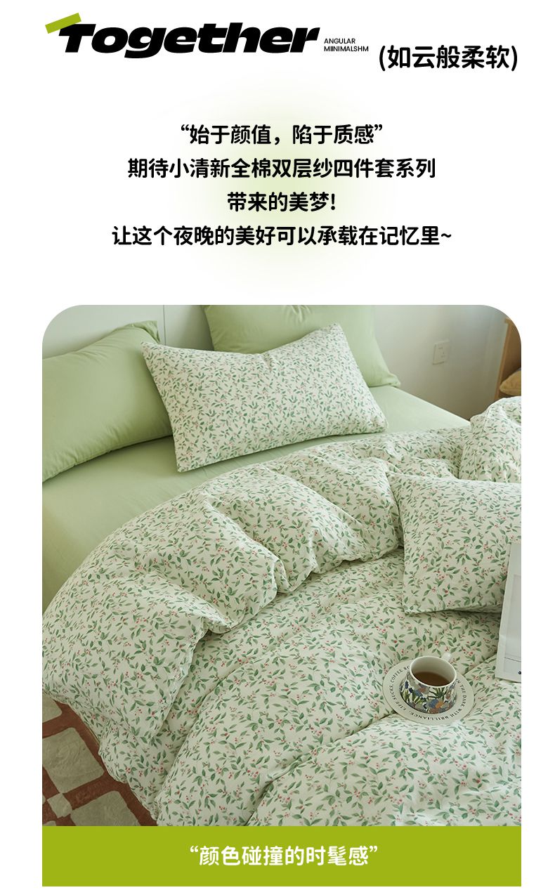 当前位置: 91家纺网 > 商品网购 > 床品套件 > 四件套 > 全棉普通四件套 > 趣色家纺 2025新款A类全棉双层纱印花四件套 桑柔