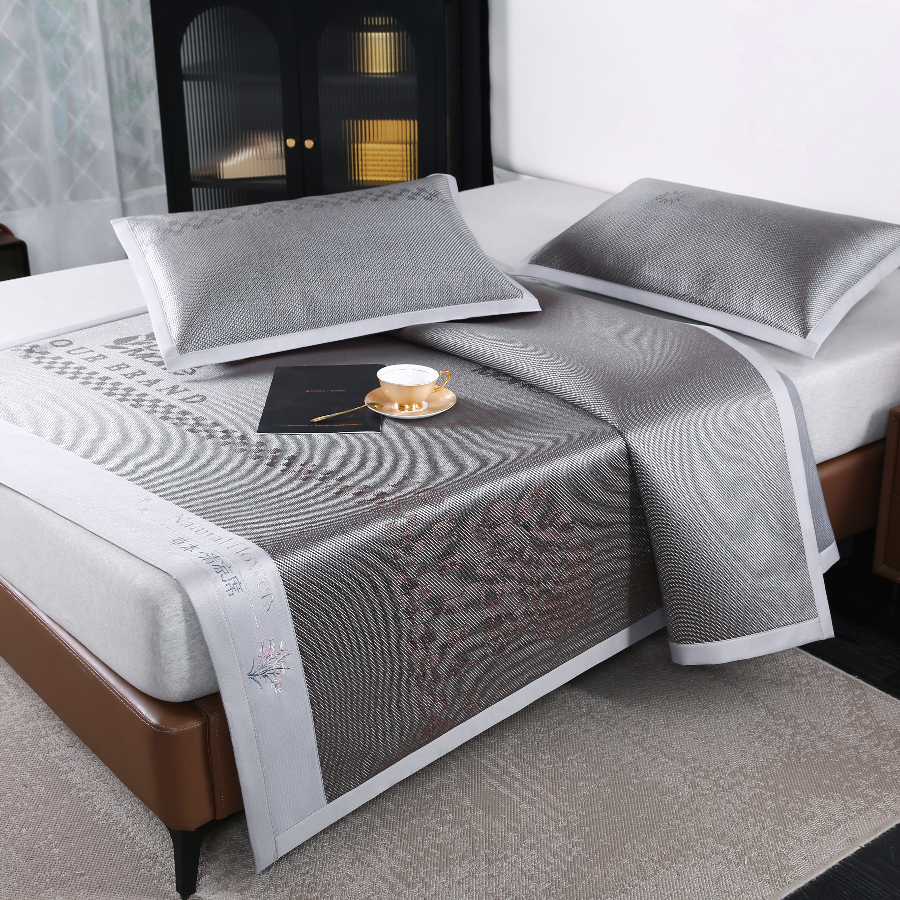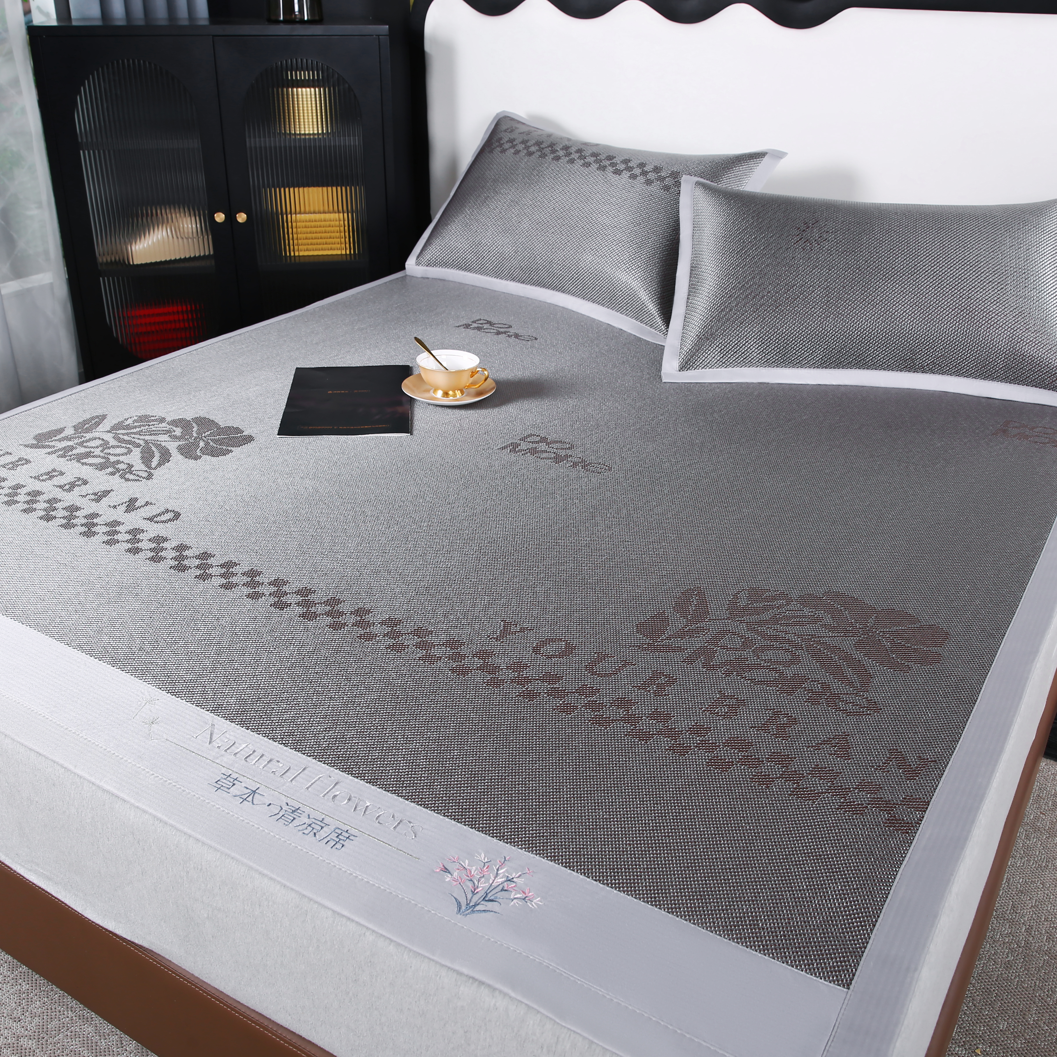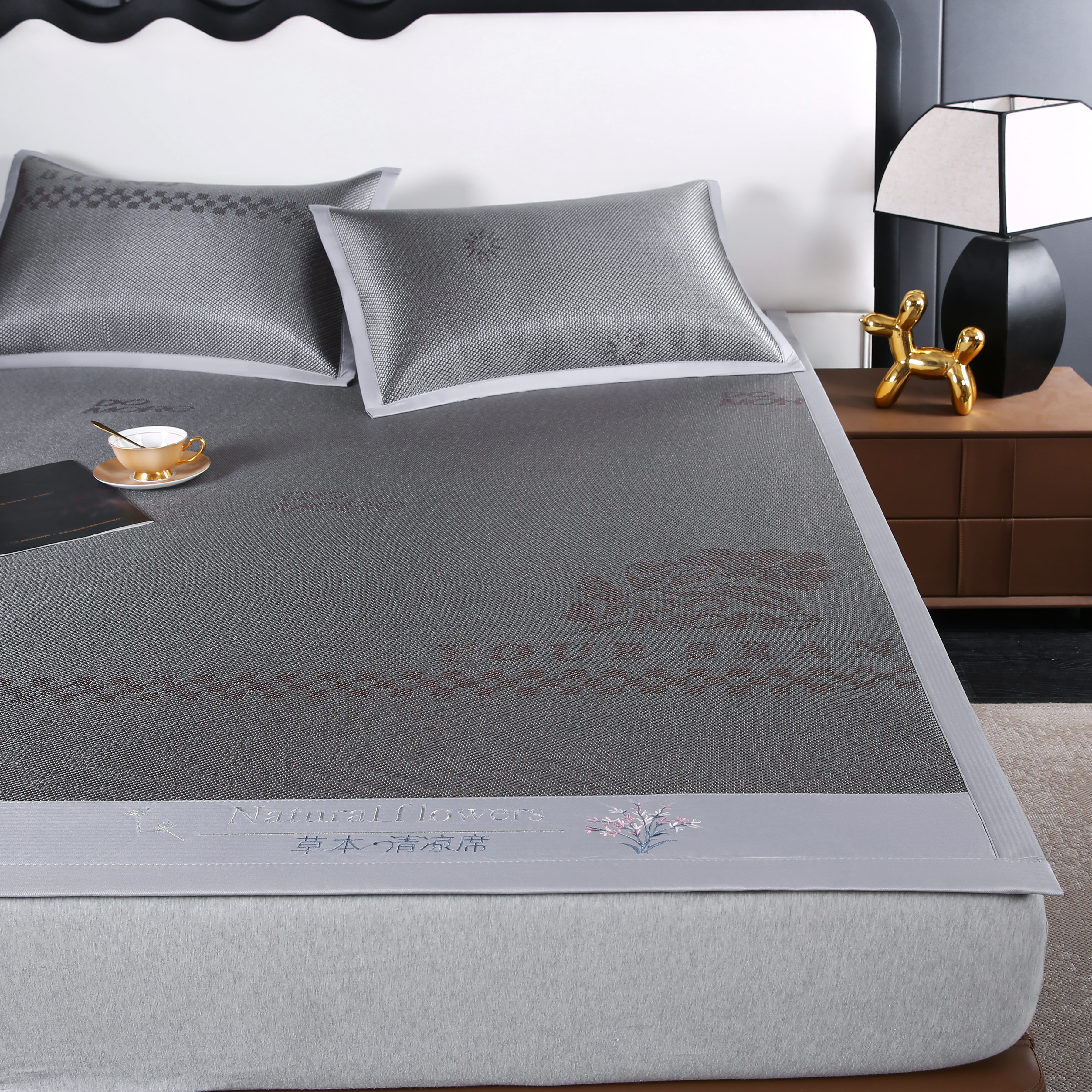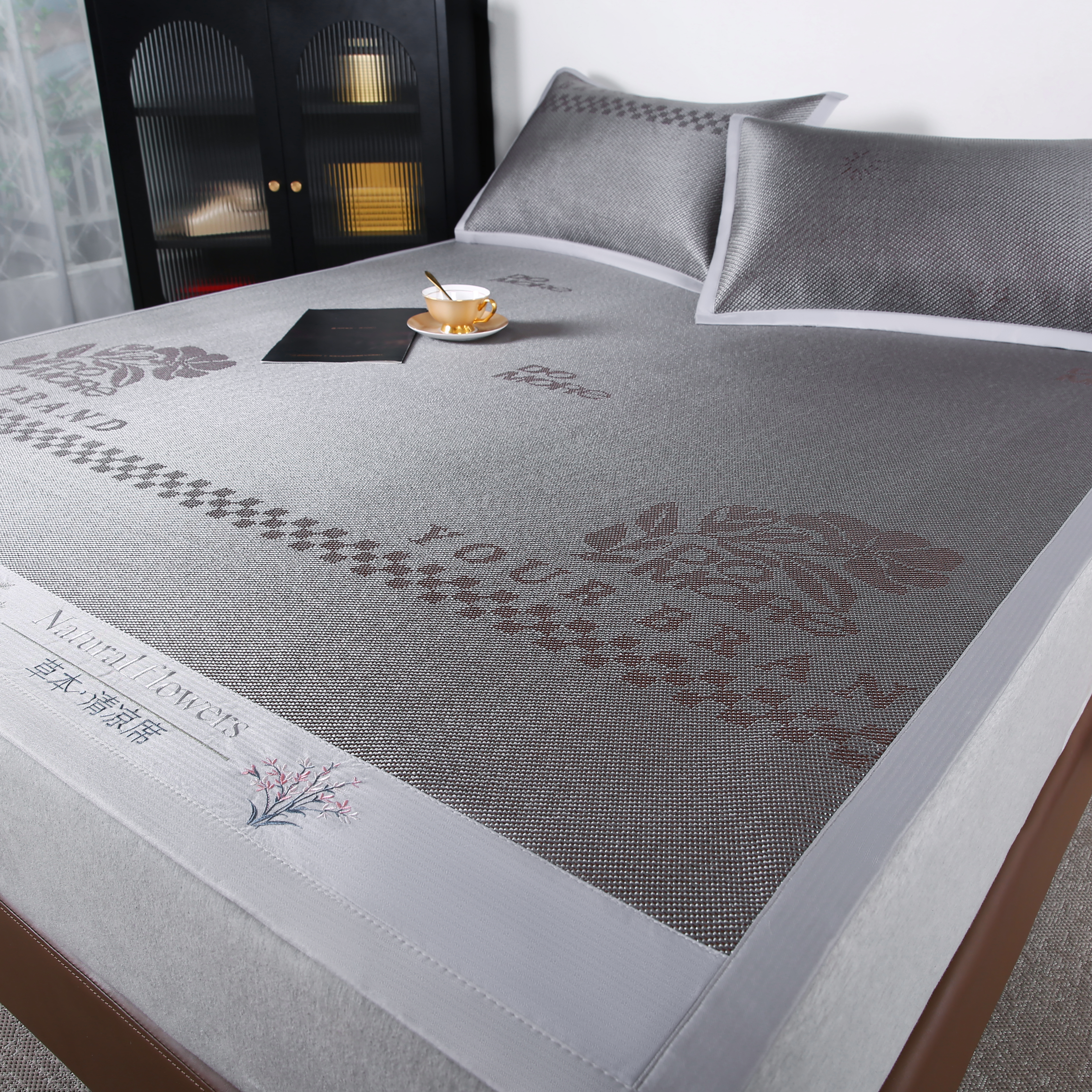 商品名称:2025新款加厚冰藤席凉席三件套宽包边刺绣款三明治冰藤凉席 灰色