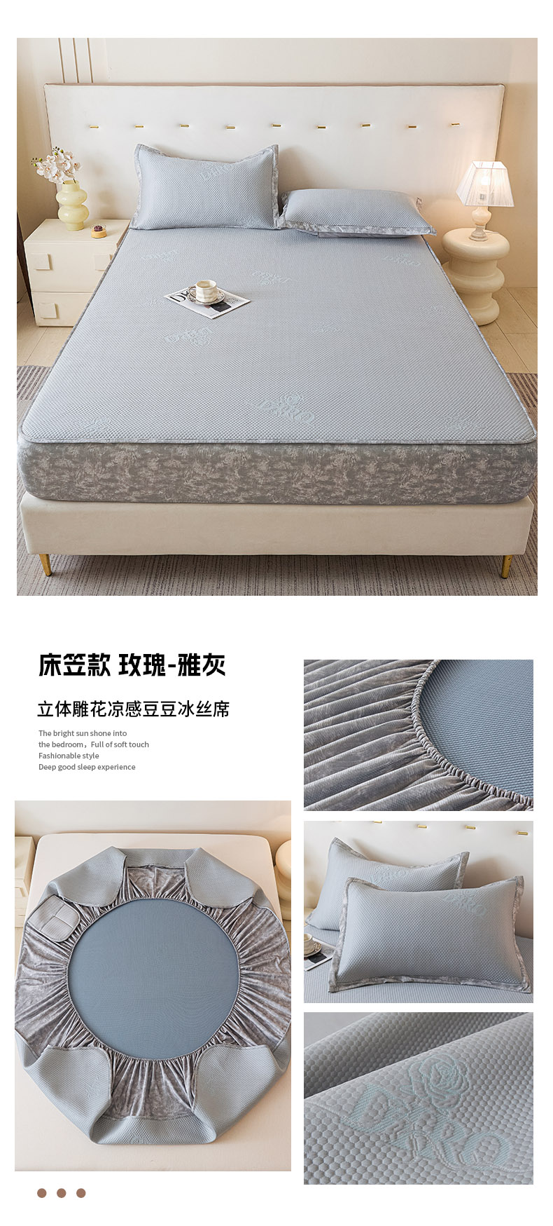 商品名称:鑫琪莱 2025新款5D立体雕花凉感豆豆冰丝席凉席席子系列 床笠款-玫瑰-雅灰
