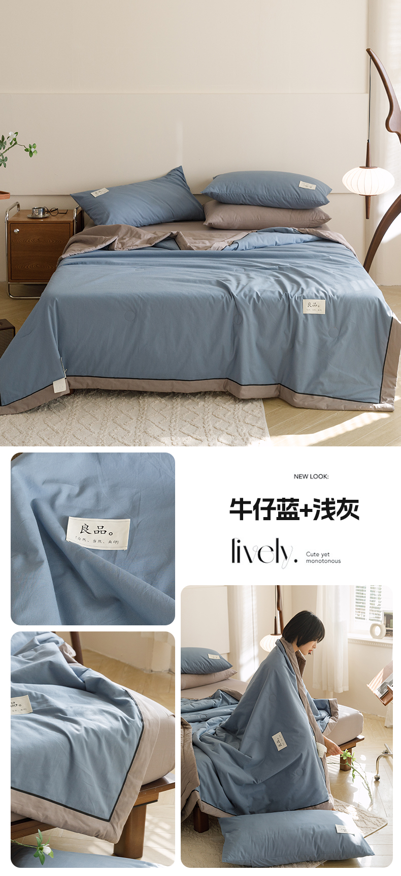 • 91家纺网 家纺一手货源 找家纺 寐绸家纺 2025新款纯棉水洗棉简约双拼大豆纤维夏被四件套 宾利蓝+浅灰