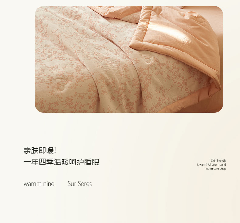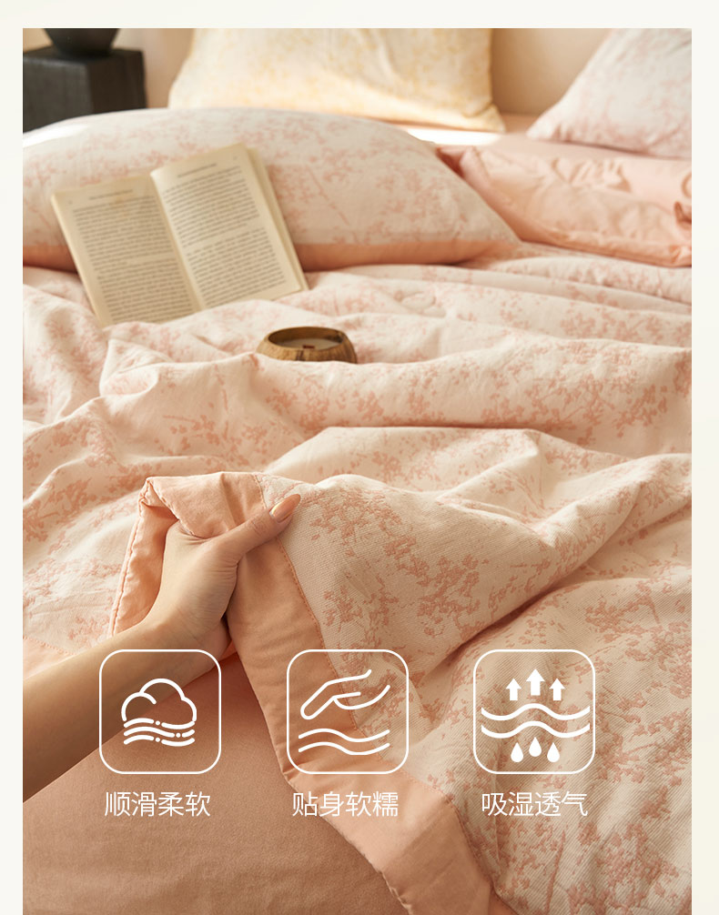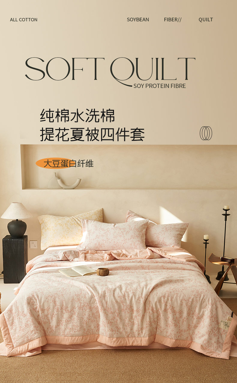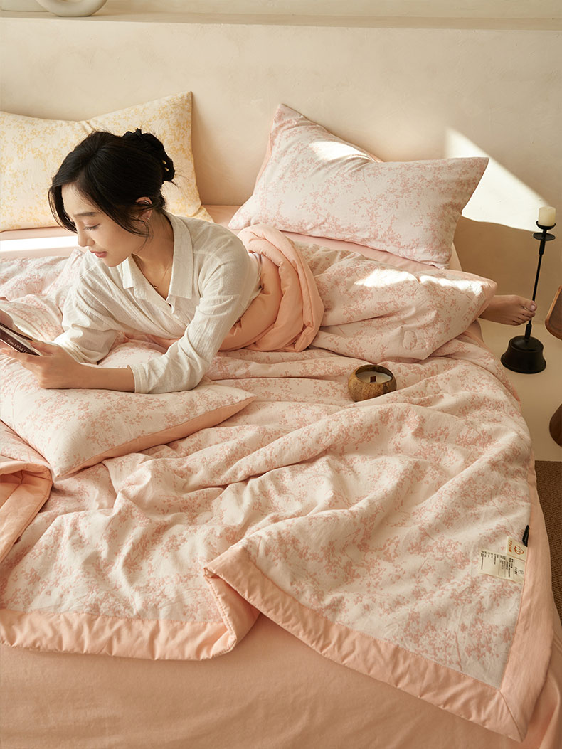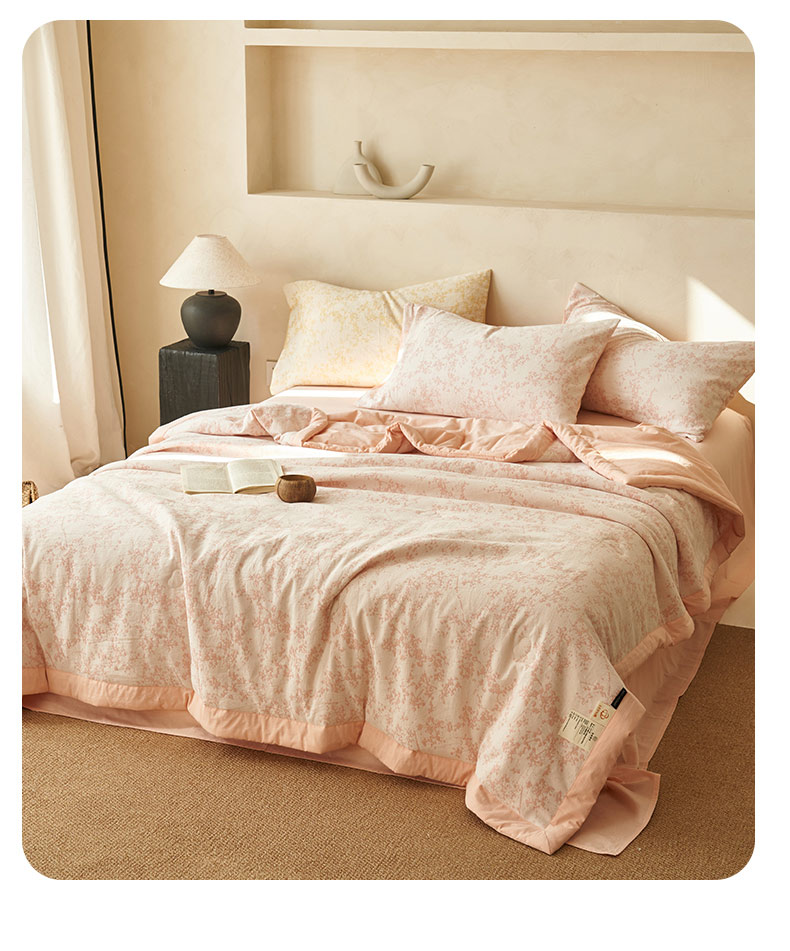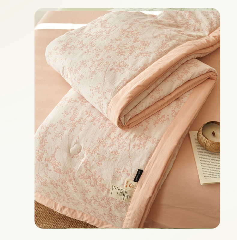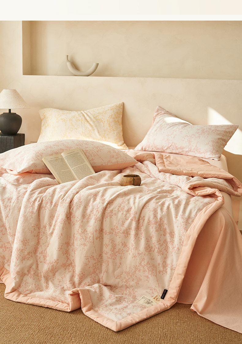 • 91家纺网 家纺一手货源 找家纺 寐绸家纺 2025新款纯棉水洗棉三层繁花提花大豆纤维夏被四件套 繁花夏被-浅粉