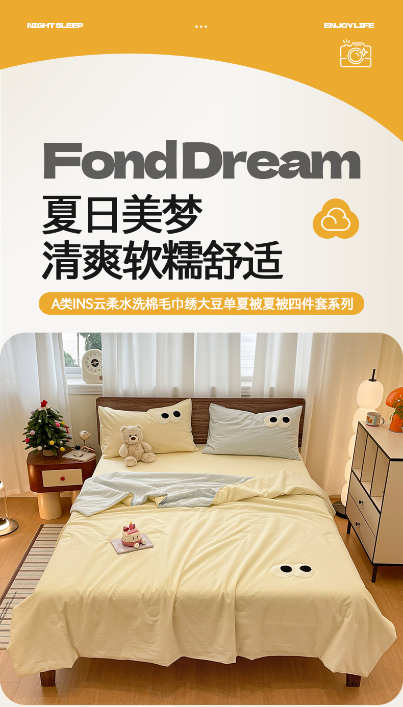 • 91家纺网 家纺一手货源 找家纺 桃心家居 2025新款云柔水洗棉毛巾绣大豆单夏被夏被四件套 水洗棉-大眼睛夏被奶黄小蓝格