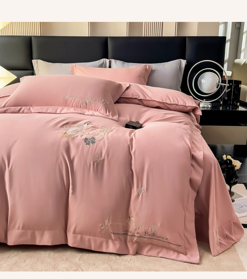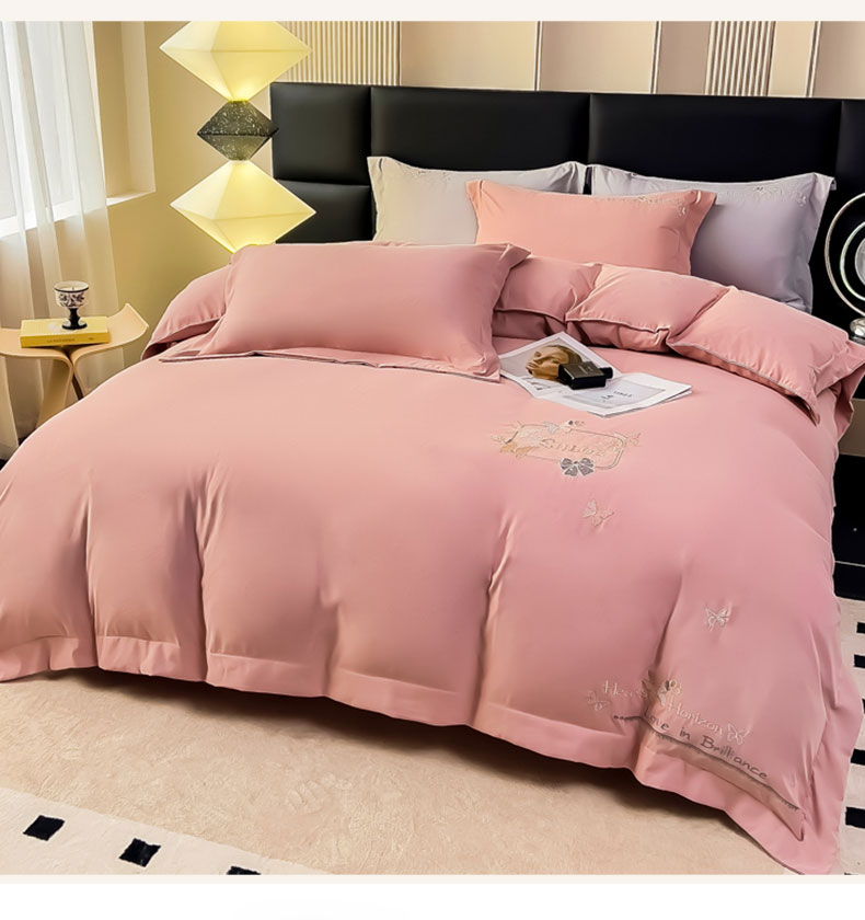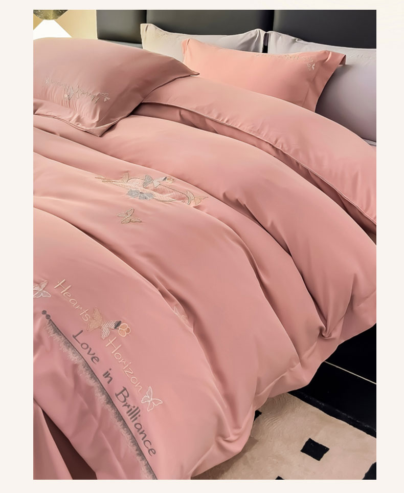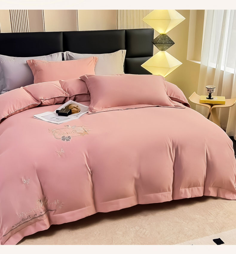 曲之慕 2025新品四季款高端刺绣四件套简约可水洗轻奢纯色刺绣四件套 梦飞令浪漫粉