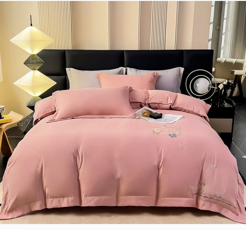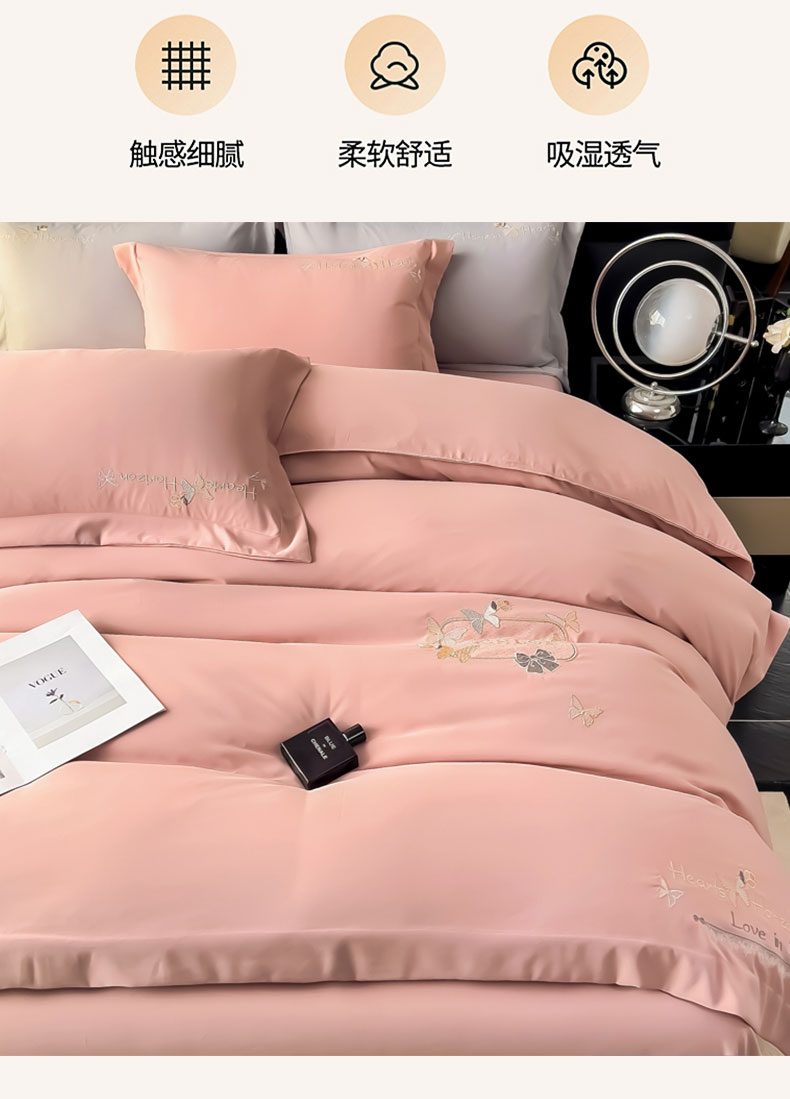 商品名称:曲之慕 2025新品四季款高端刺绣四件套简约可水洗轻奢纯色刺绣四件套 梦飞令浪漫粉