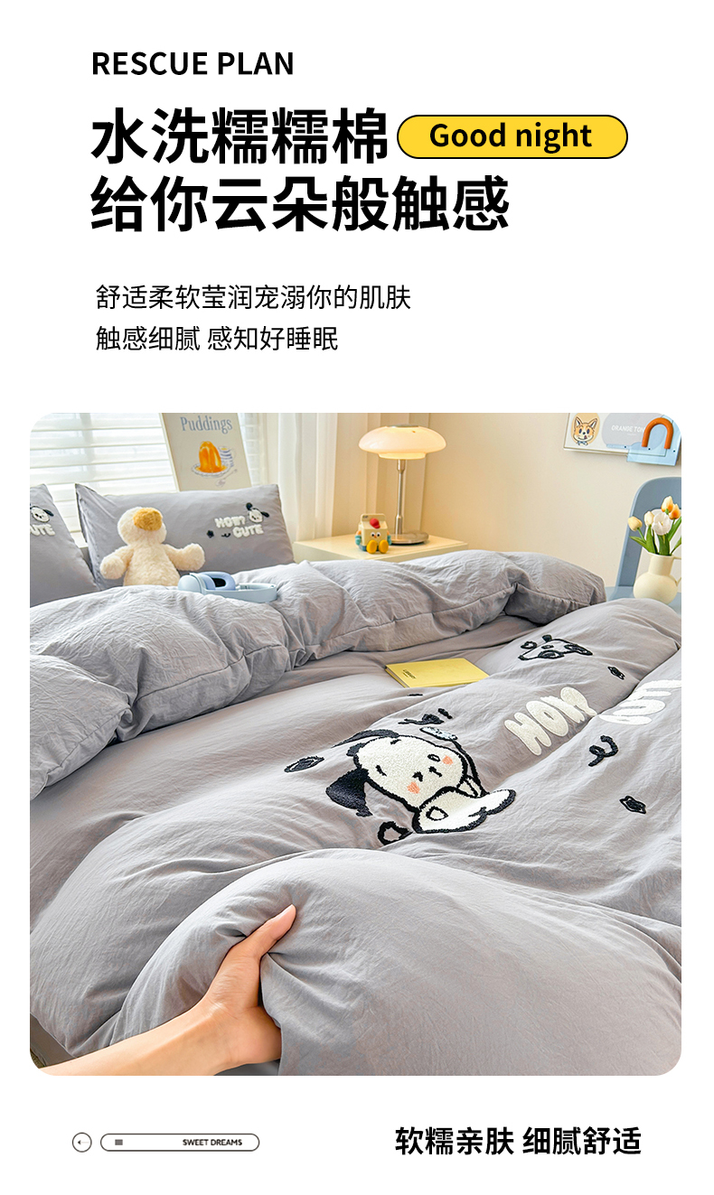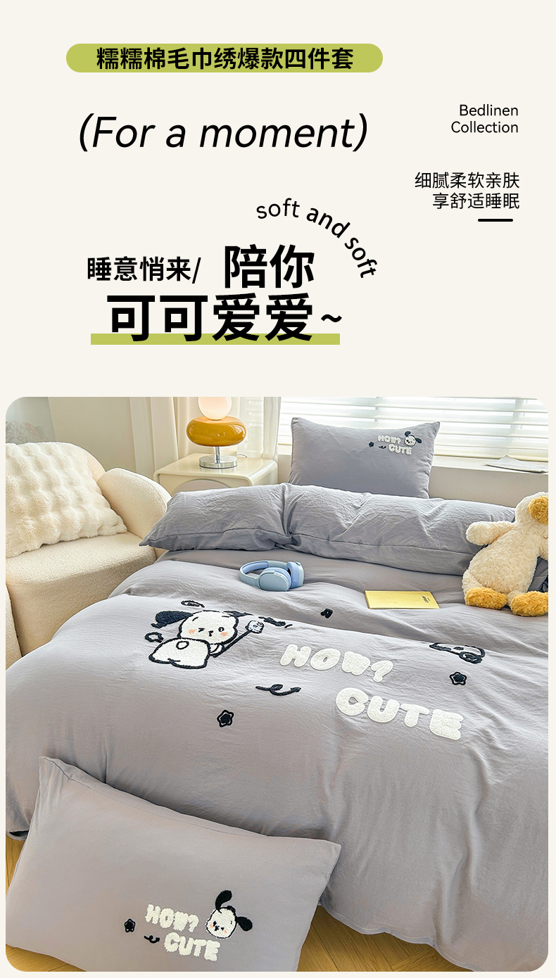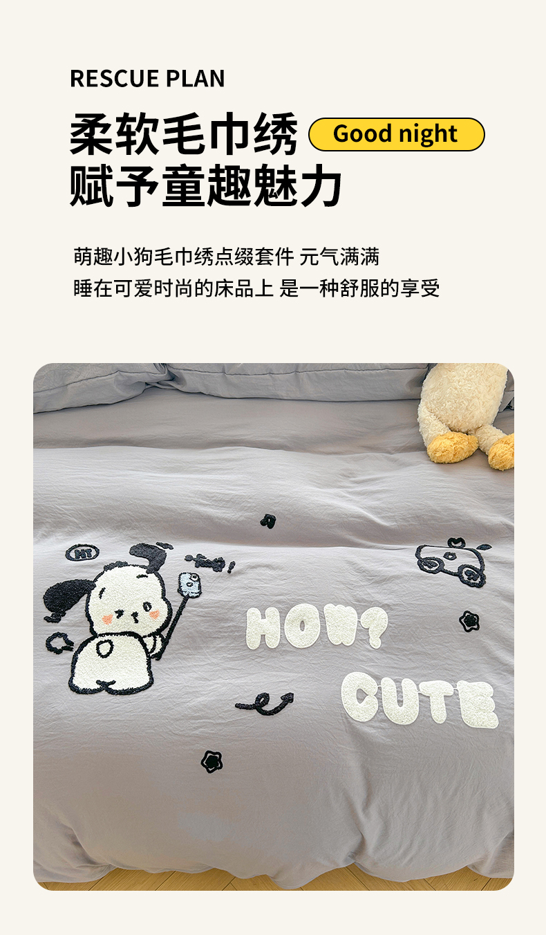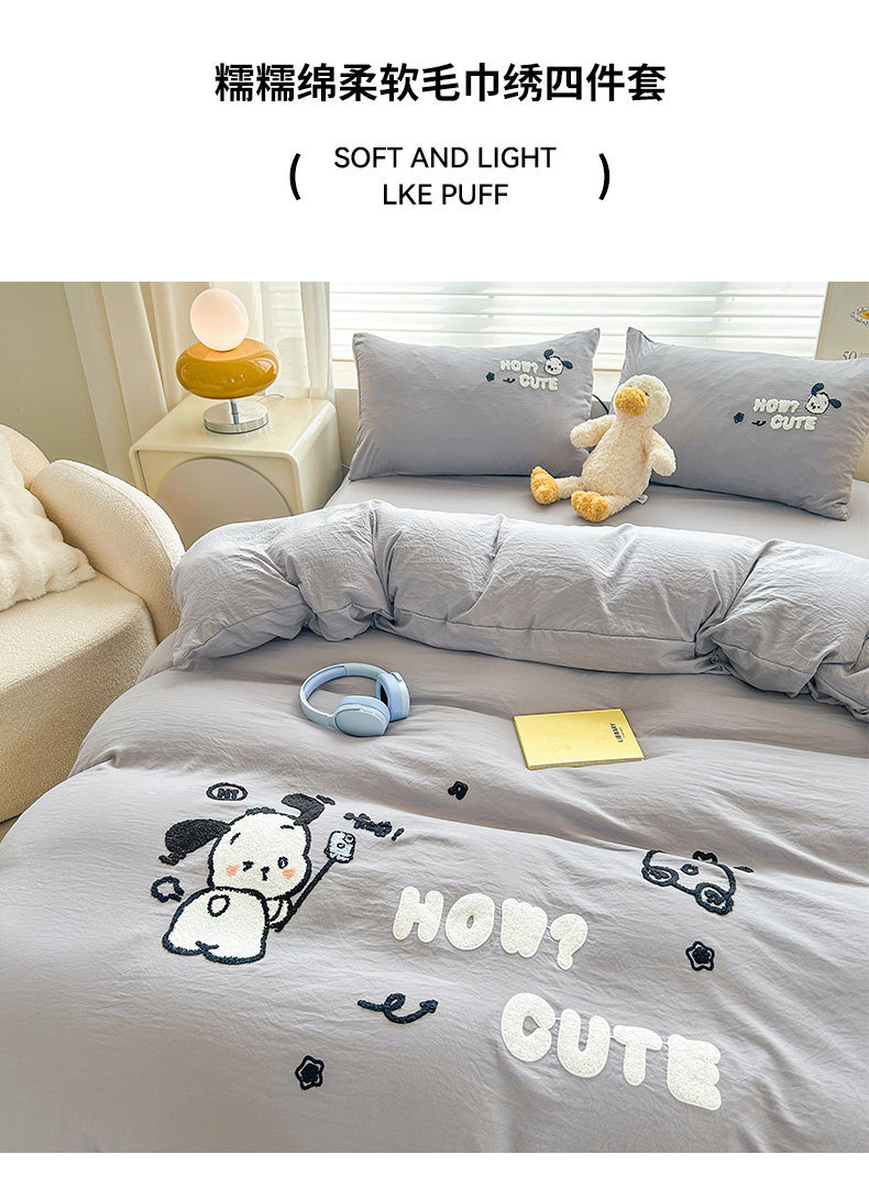 商品名称:包小包 2025新款糯糯绵毛巾绣可爱卡通爆款四件套 顽皮狗-灰