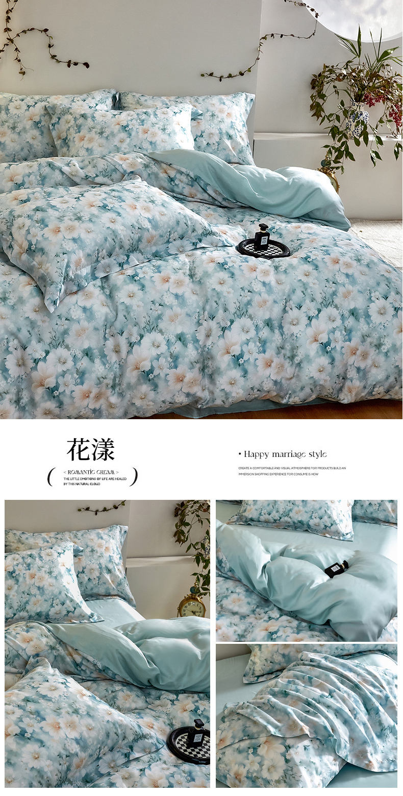 商品名称:未来家居 2025春夏新款100支莱赛尔天丝贡缎纯色印花系列高端礼盒四件套 花漾