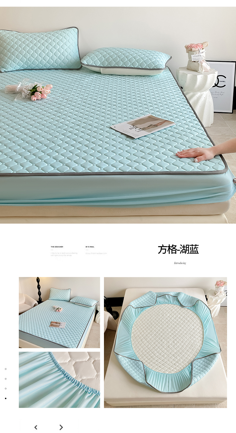 商品名称:2025新款加厚0.5纯色凉感丝单床笠乳胶凉席 方格-湖蓝