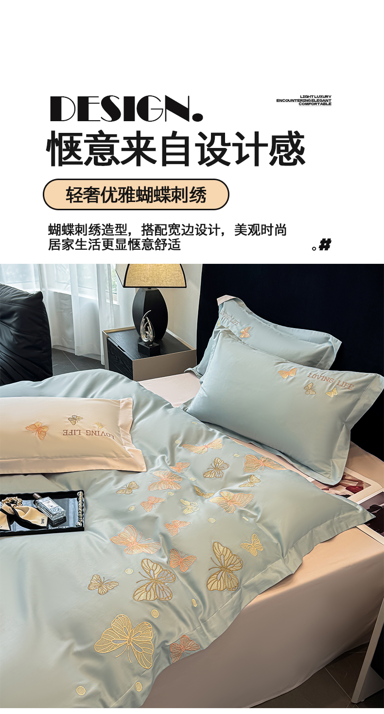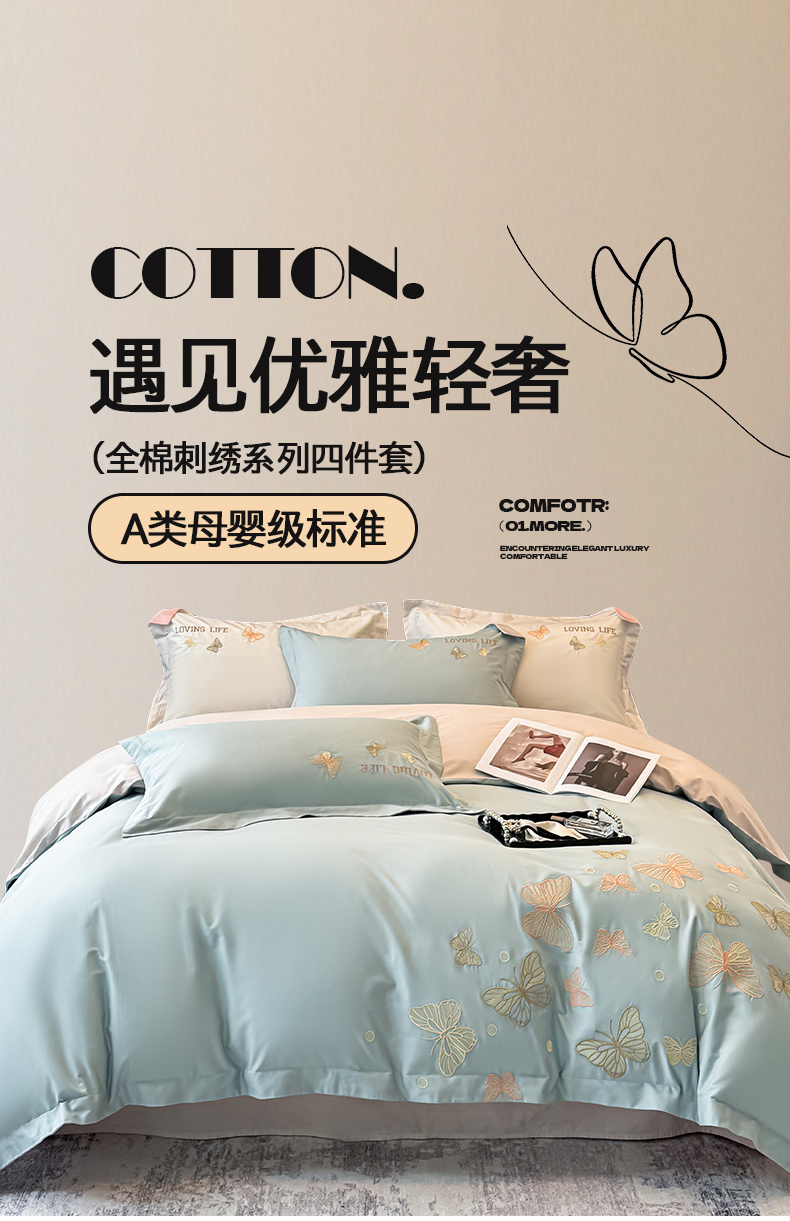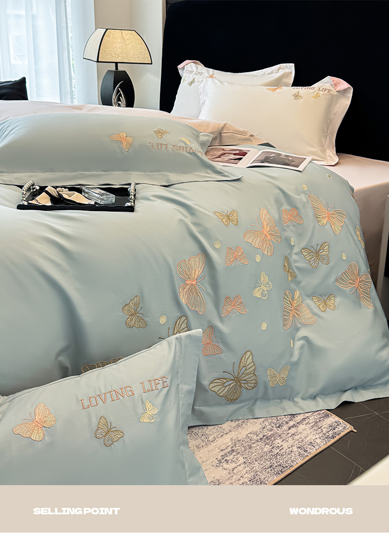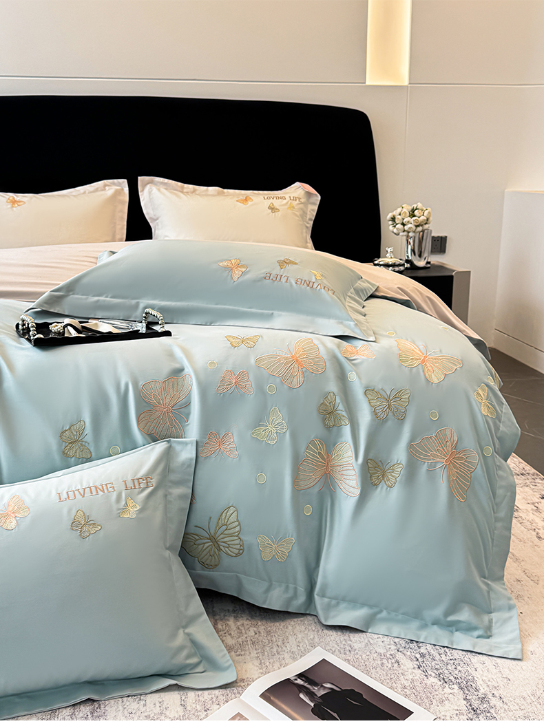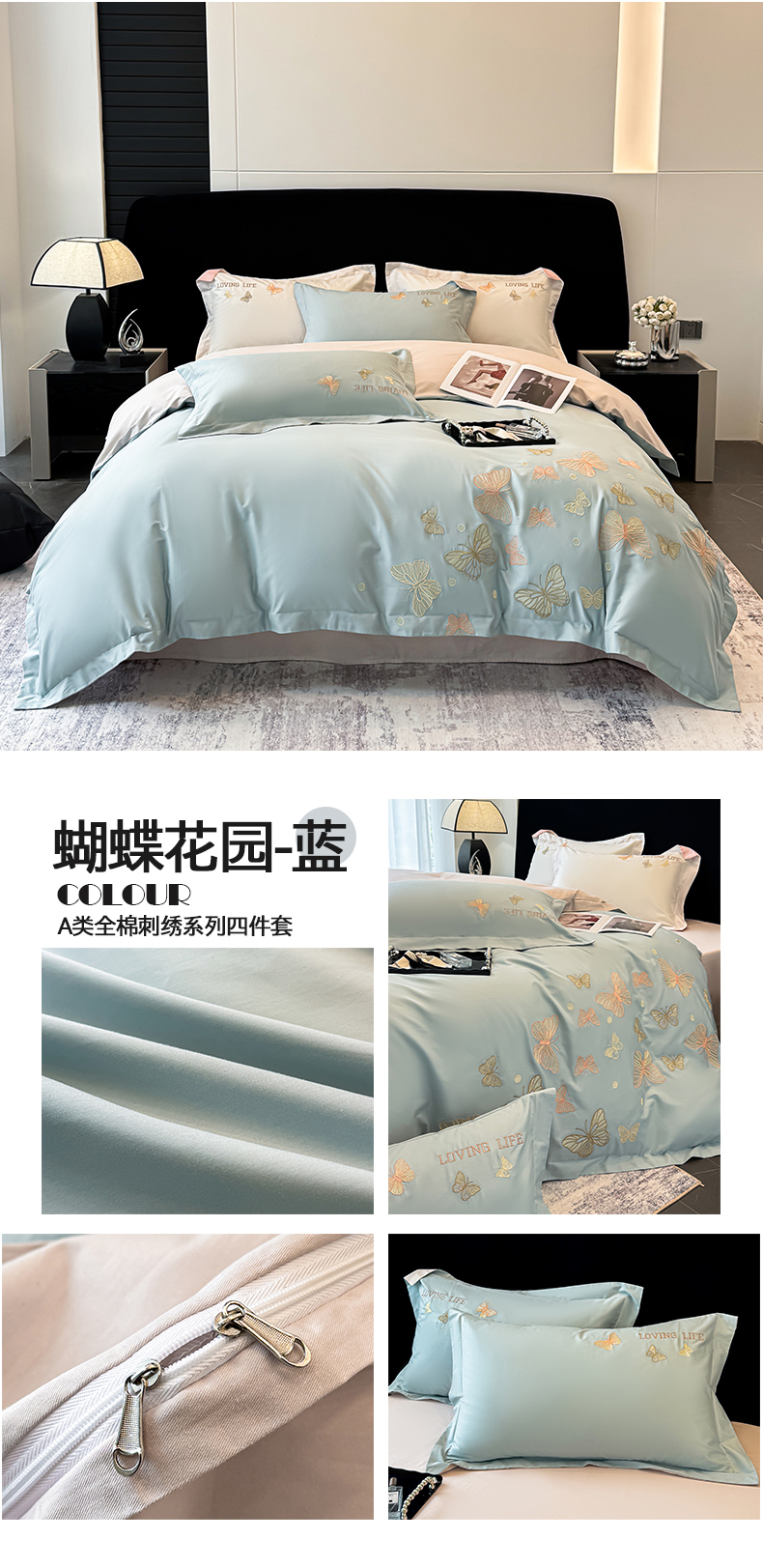 典曼家纺 2025新款 A类高精密40支13374喷气绣花四件套 【带礼盒】 蝴蝶花园-蓝
