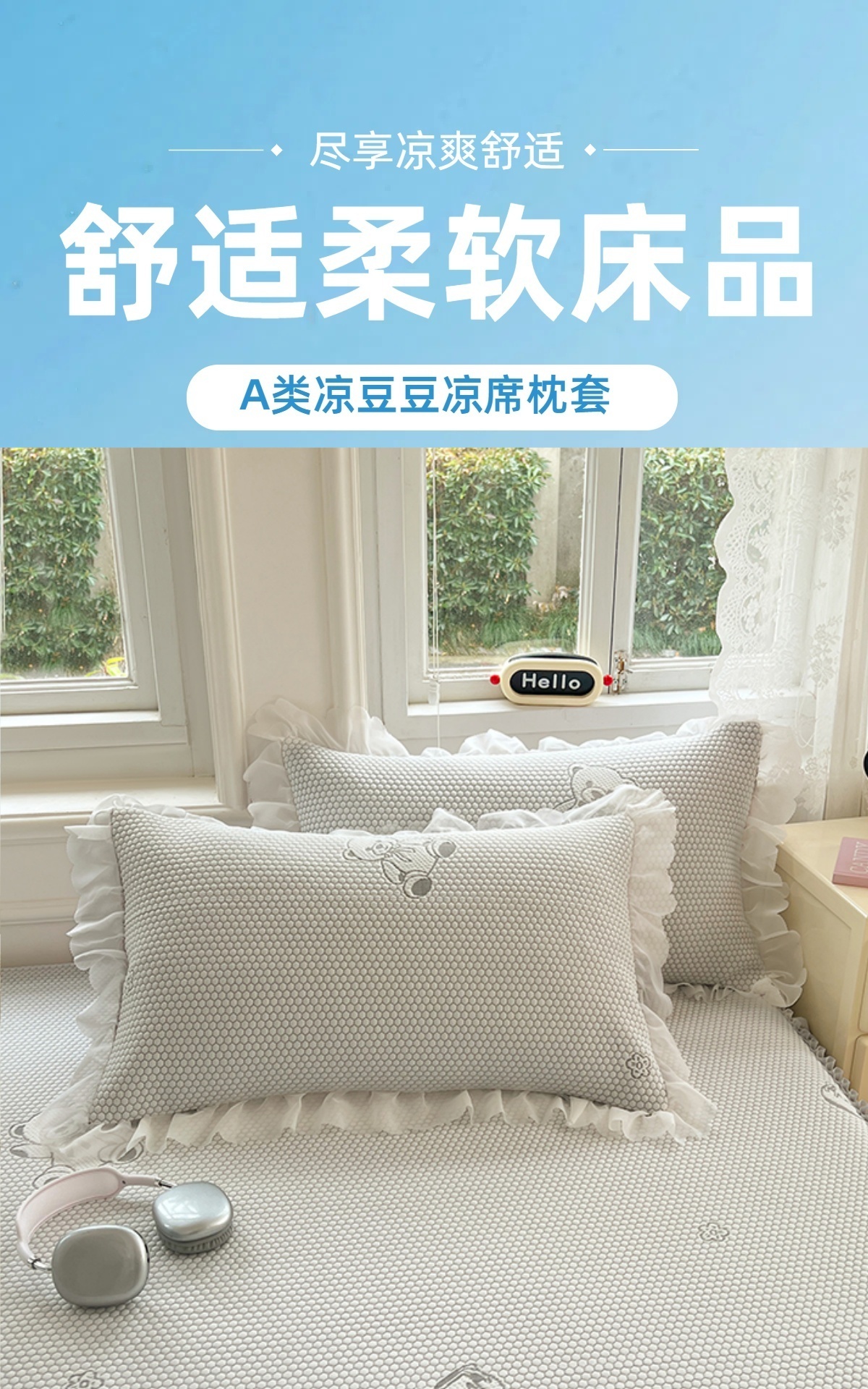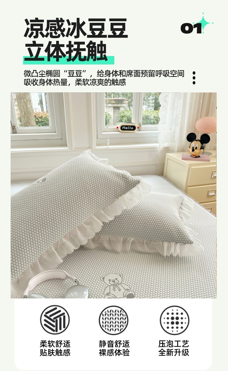 商品名称:圣比熊 2025新款凉感冰豆豆凉席花边枕套宿舍一只装枕头套一对枕芯套 冰豆豆-小熊灰