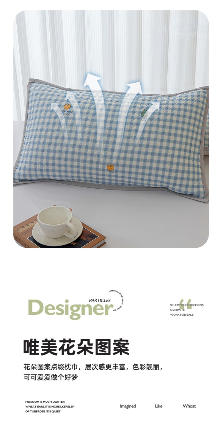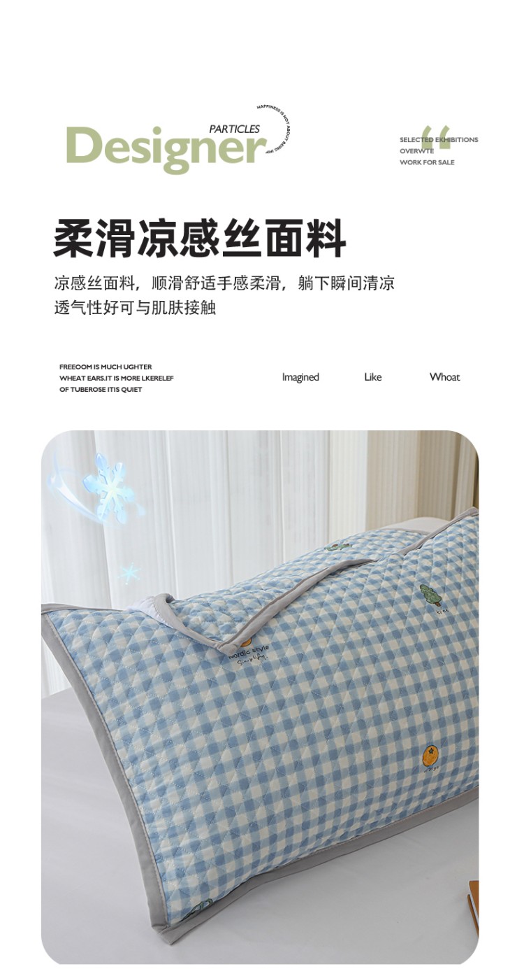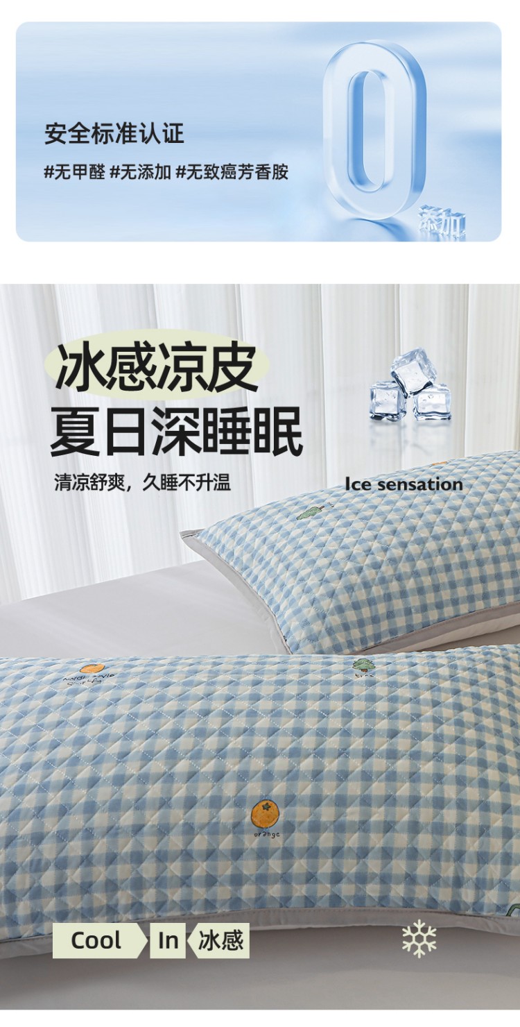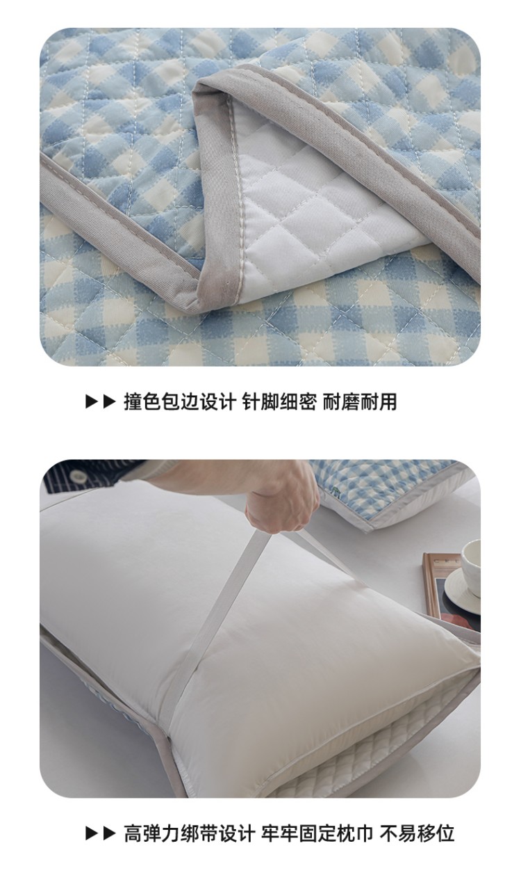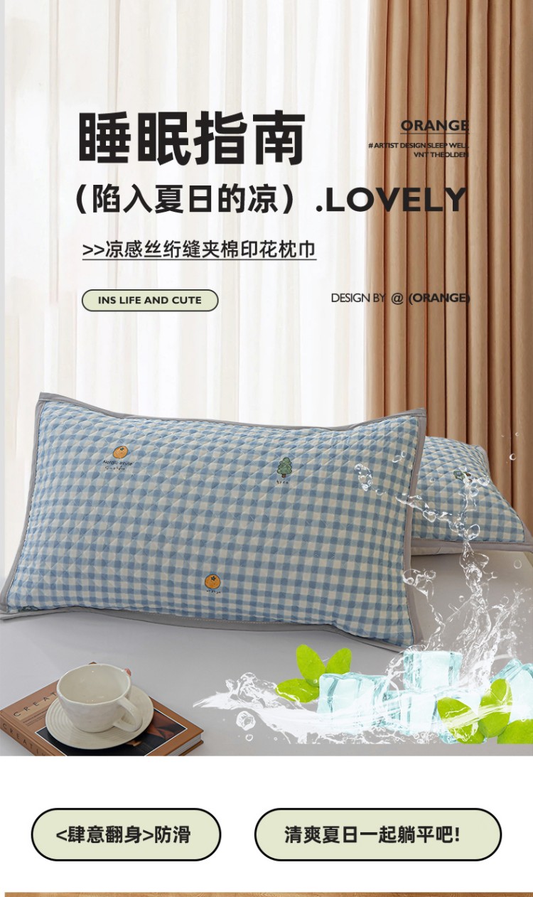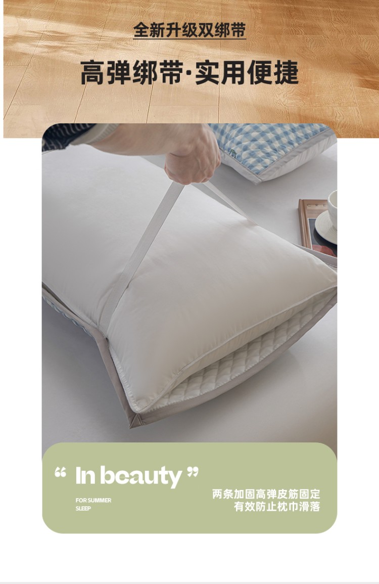 商品名称:美宜家 2025新款夏季凉感丝绗缝绑带枕巾隔脏吸汗冰丝枕巾 简约 一对