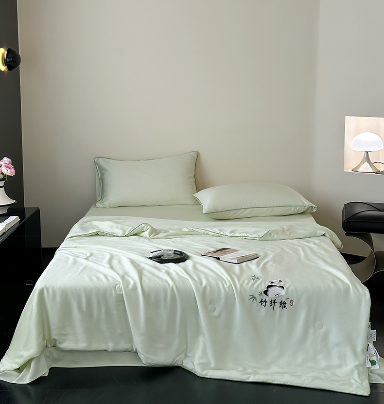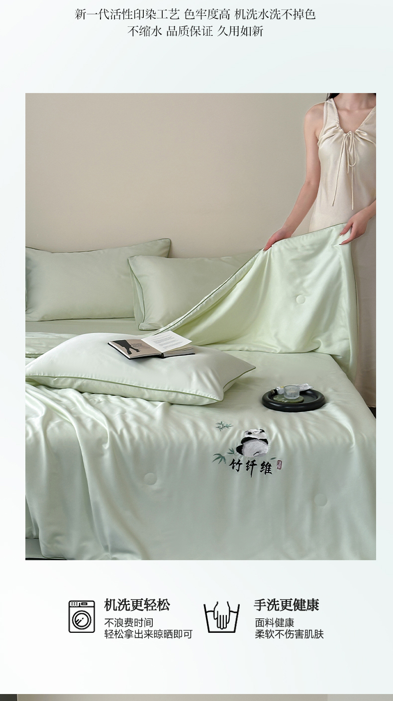 • 91家纺网 家纺一手货源 找家纺 卡巴伦2025新款A类天竹刺绣蚕蛹蛋白纤维夏被四件套 熊猫-苹果绿