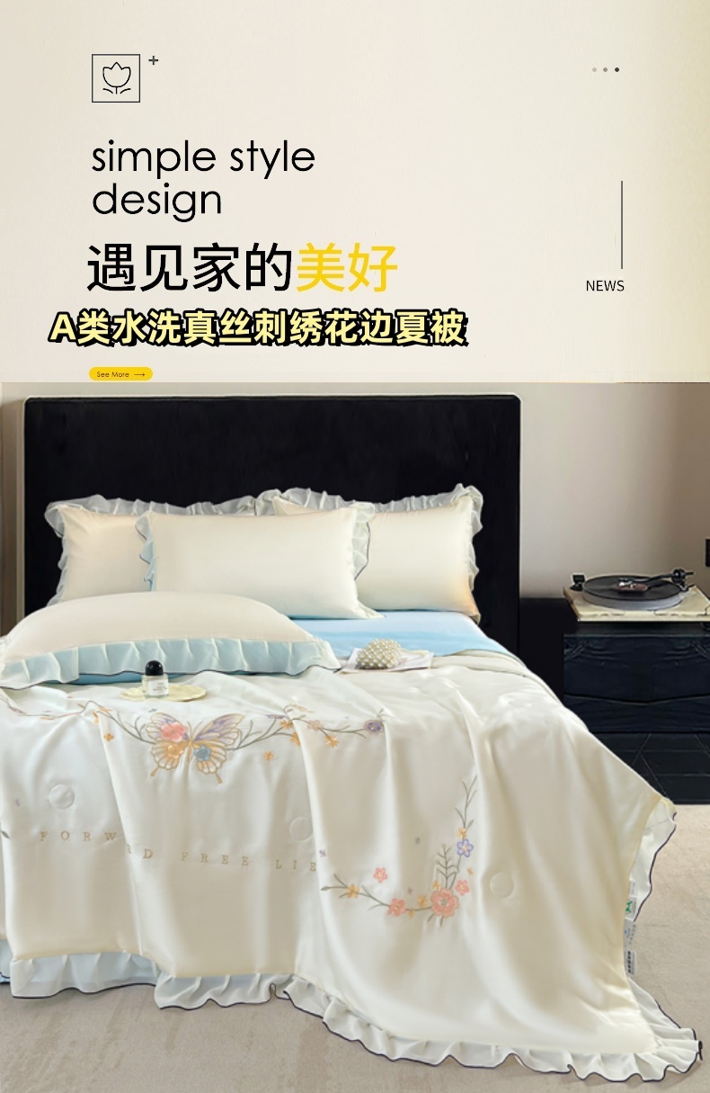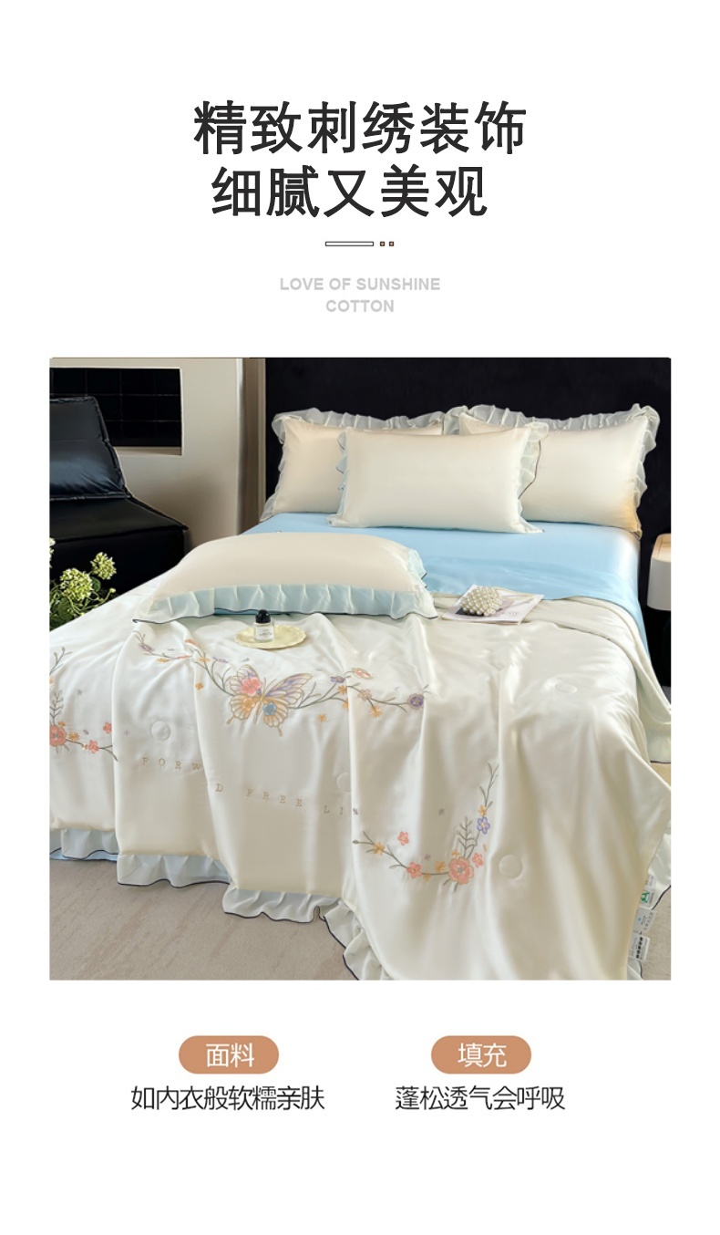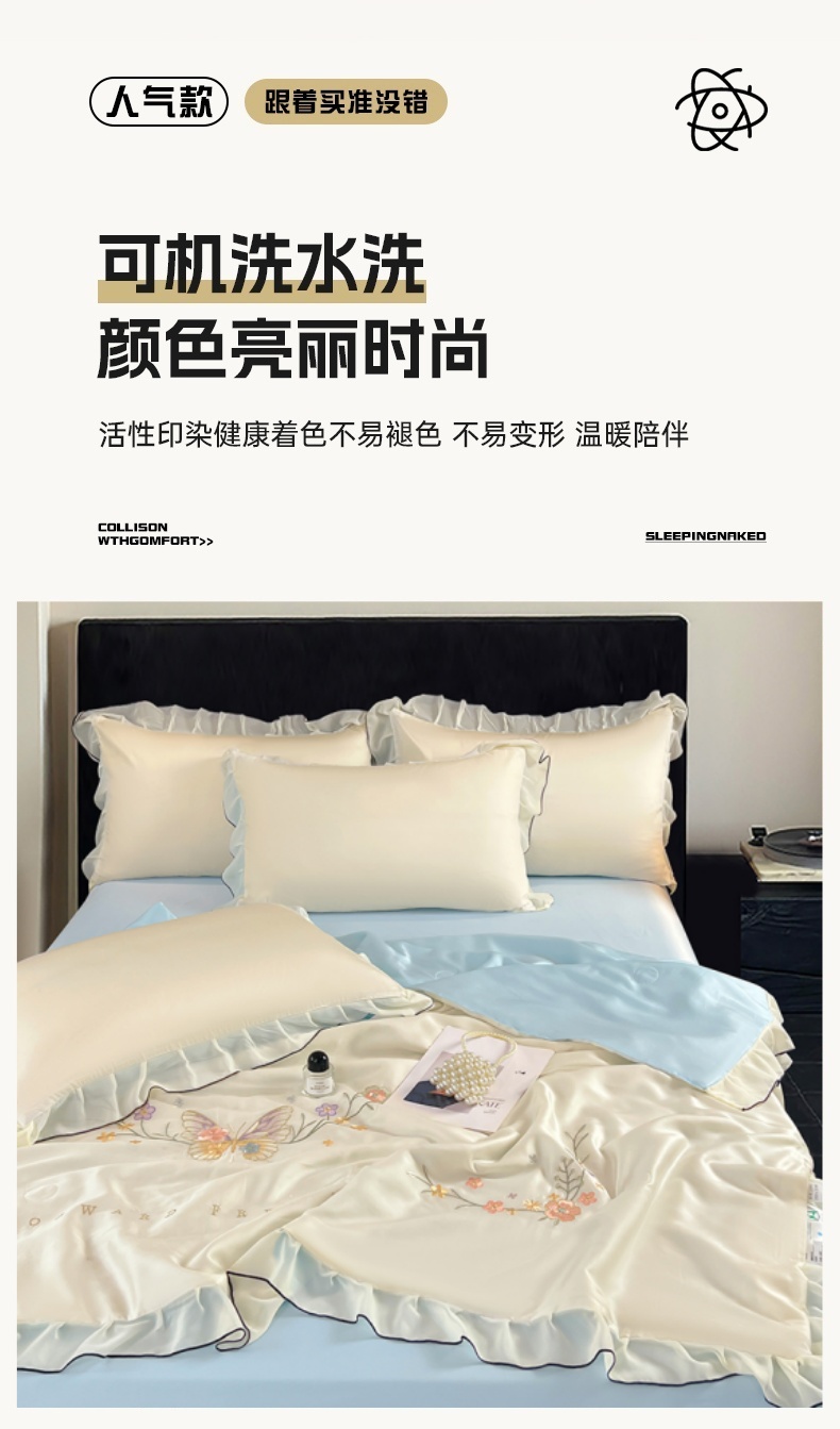 • 91家纺网 家纺一手货源 找家纺 梦舒羽 2025新款刺绣水洗真丝花边夏被四件套宿舍夏凉被床单枕套三件套-花韵花边款 花韵-蓝(花边款)