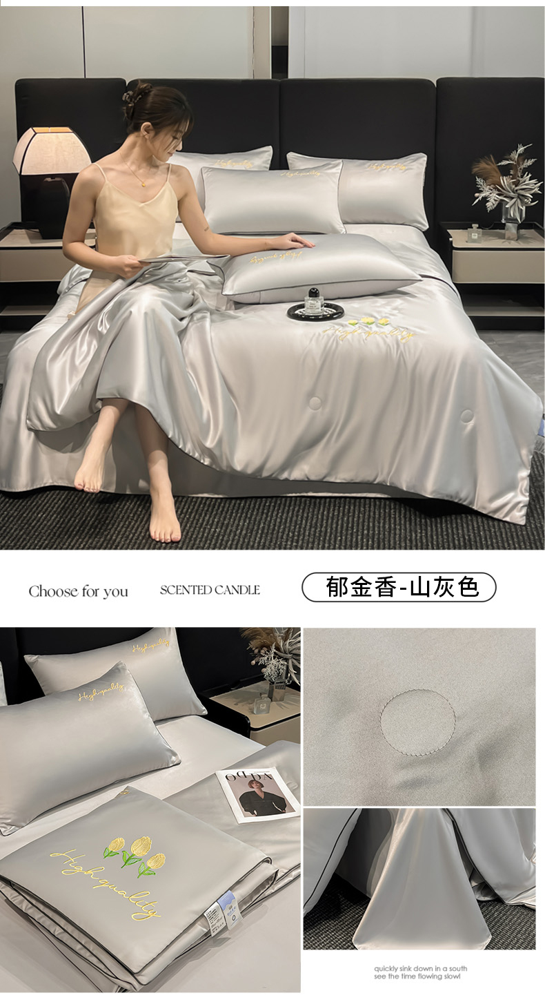 • 91家纺网 家纺一手货源 找家纺 伊梵居 2025新款水洗真丝刺绣夏被四件套 郁金香-山灰色