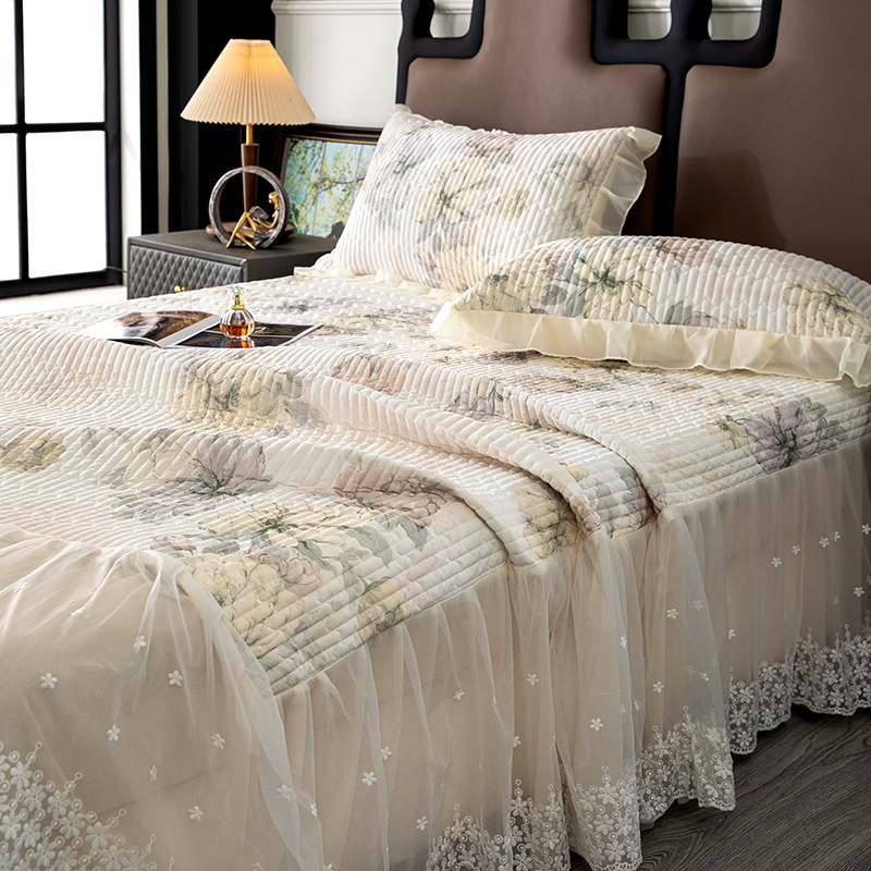 (总)2025新款纯色雕花全消光牛奶绒蕾丝绣花被套夹棉床裙 床盖款四件套(控价268),粉玉,米咖,天蓝,香芋紫,淡紫,豆纱色