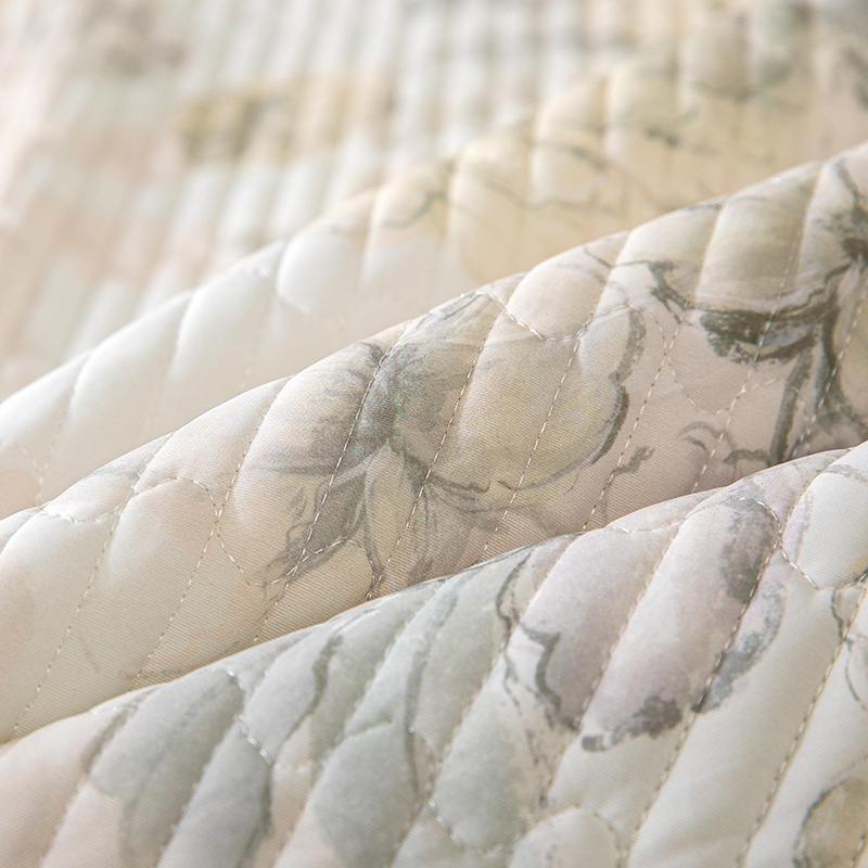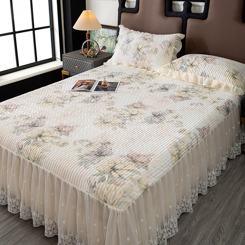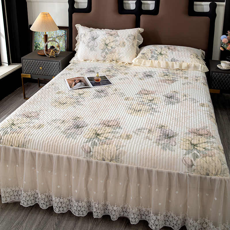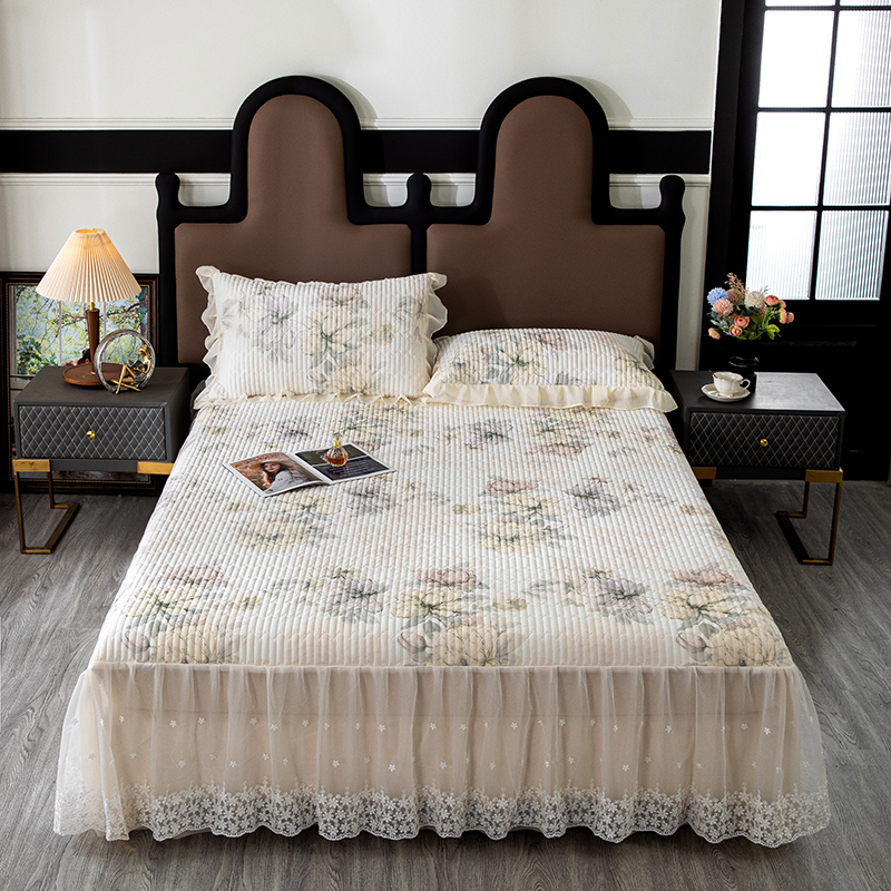 商品名称:木兰花2025新款高密凉感丝印花夹棉床裙款凉席三件套 卡梅尔-绿