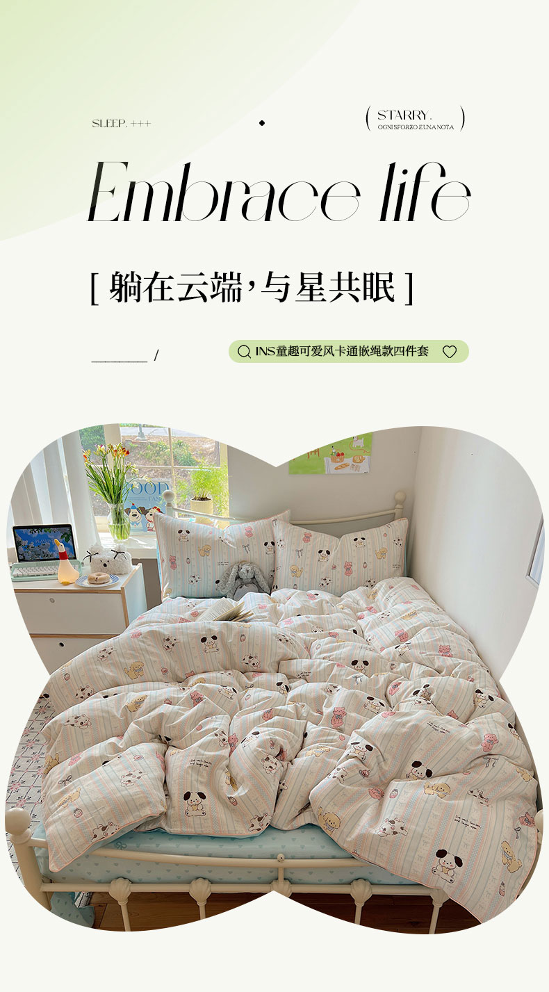 商品名称:六巷胡同 2025新款40S全棉纯棉INS童趣可爱风卡通嵌绳款四件套 嵌绳甜品咖啡猫