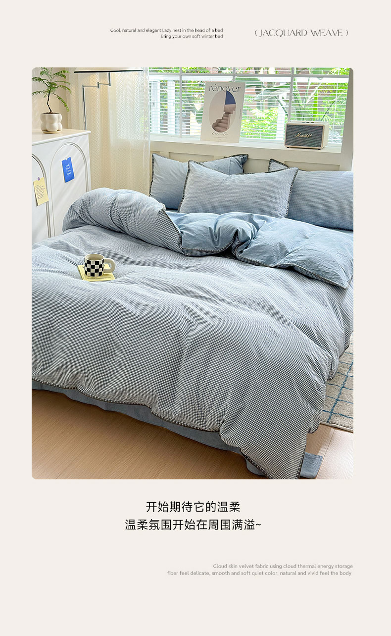 当前位置: 91家纺网 > 商品网购 > 床品套件 > 四件套 > 全棉普通四件套 > 晚依家纺 2025新款A类全棉色织水洗棉被套单件格子条纹四件套学生宿舍被罩三件套定制定做 遇见-浅蓝