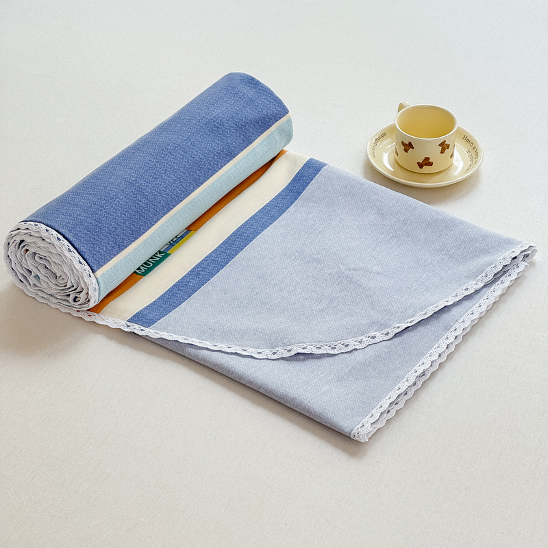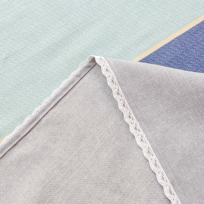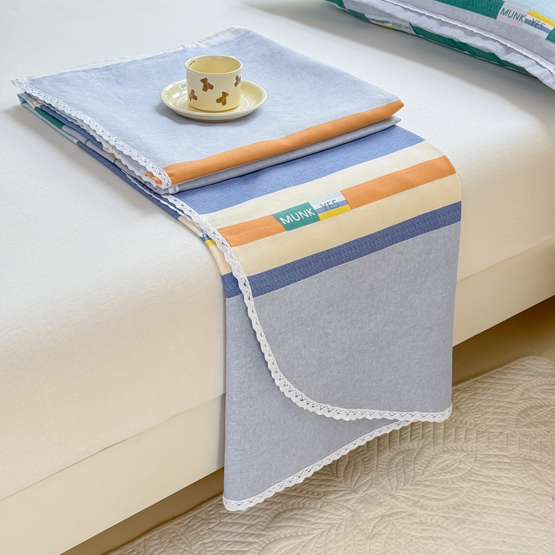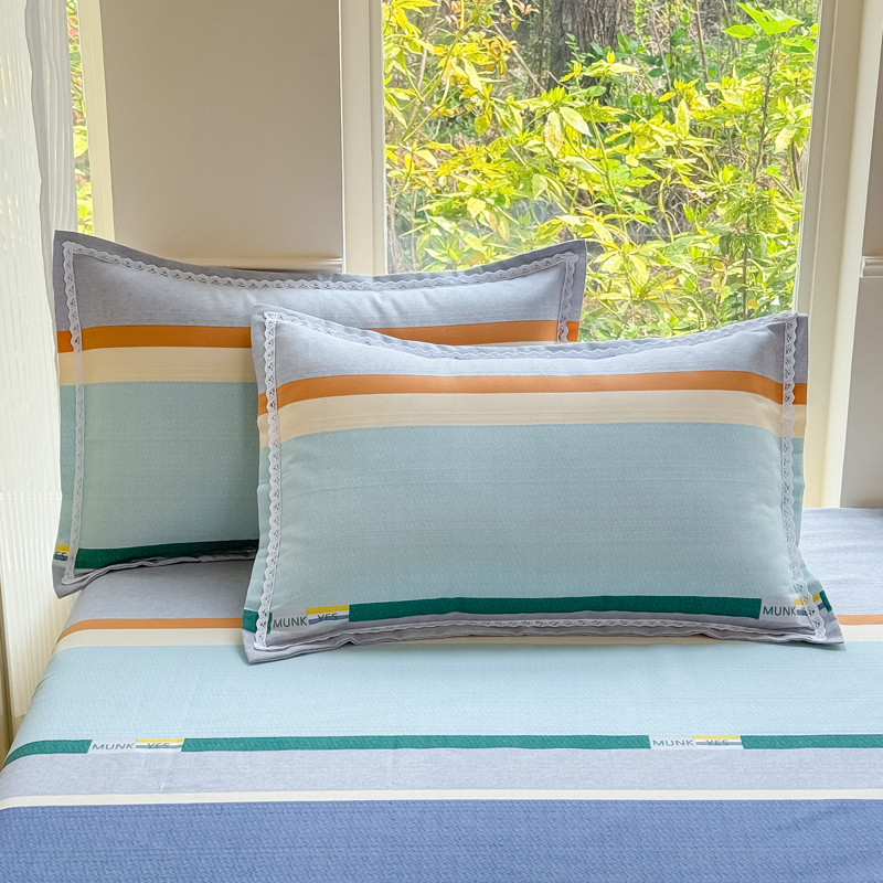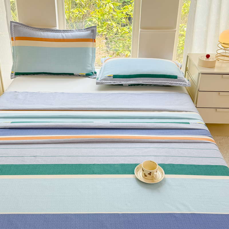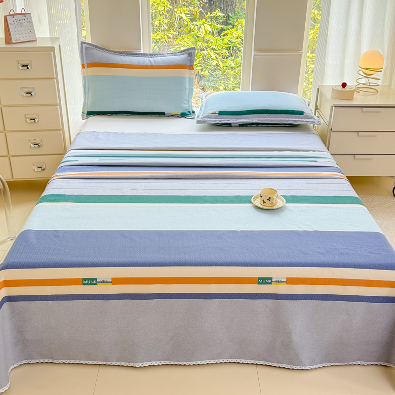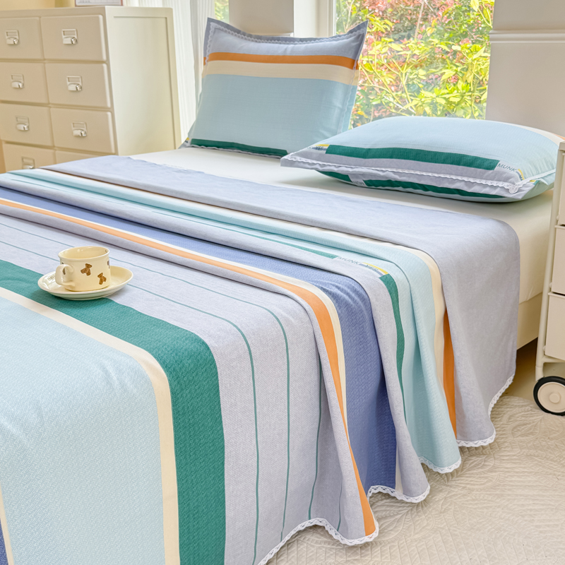 商品名称:宜家坊 2025新款春夏原棉鱼骨棉老粗布花边印花床单软凉席三件套 简彩条纹