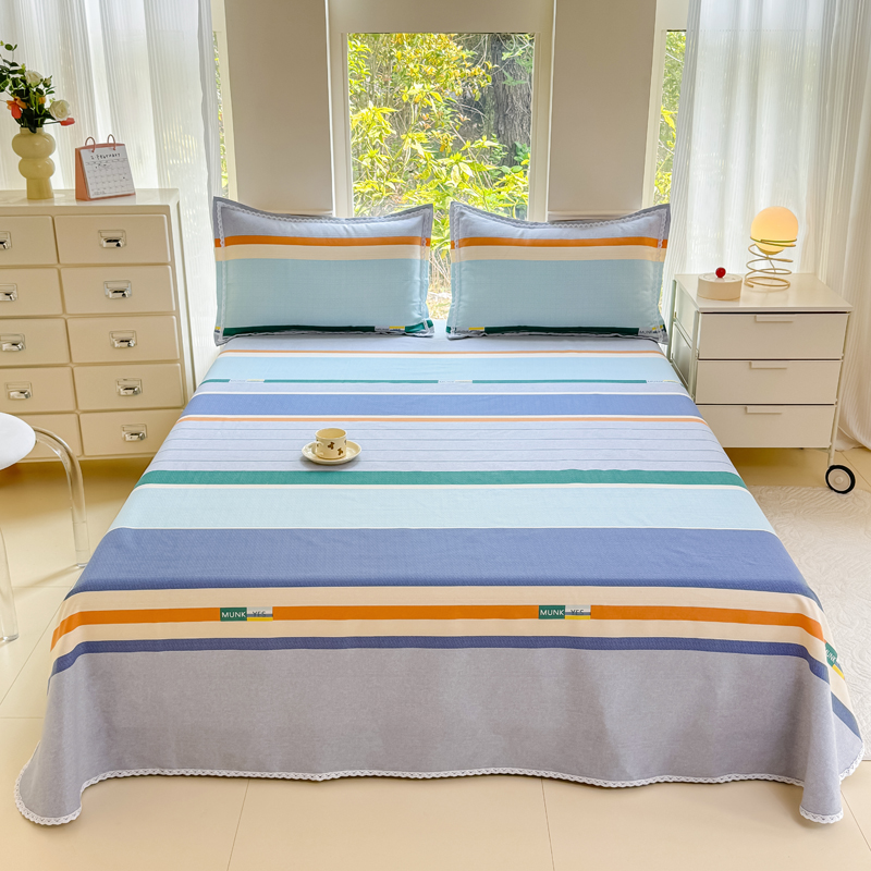 宜家坊 2025新款春夏原棉鱼骨棉老粗布花边印花床单软凉席三件套 简彩条纹