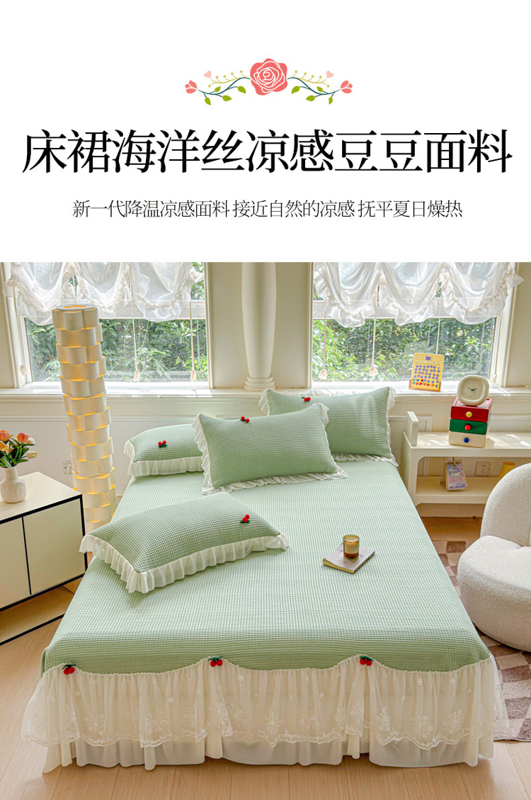 商品名称:漫布云2025新款PE高分子立体樱桃凉感丝花边床裙款冰豆豆凉席床盖三件套 可可-嫩黄