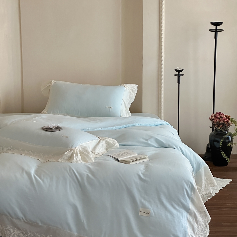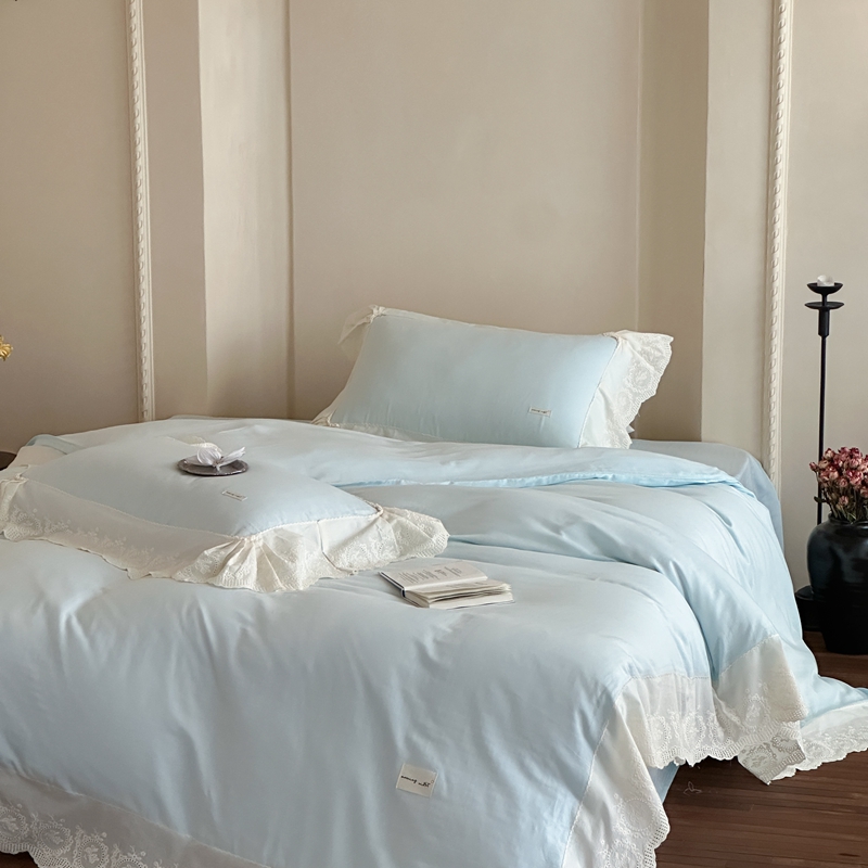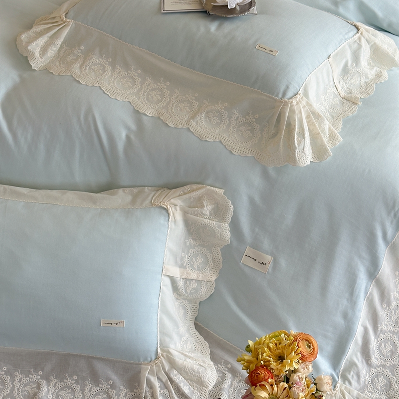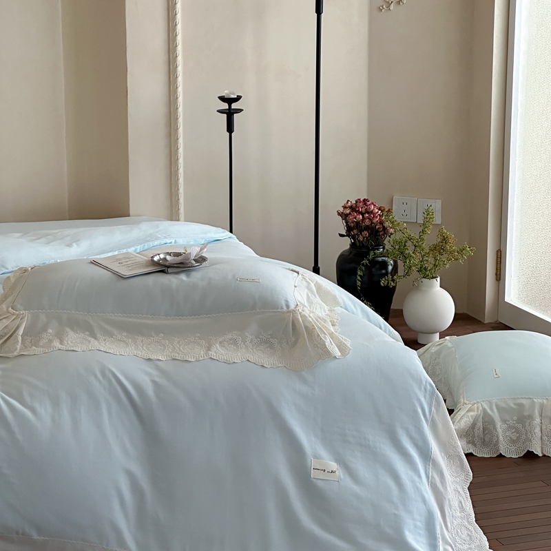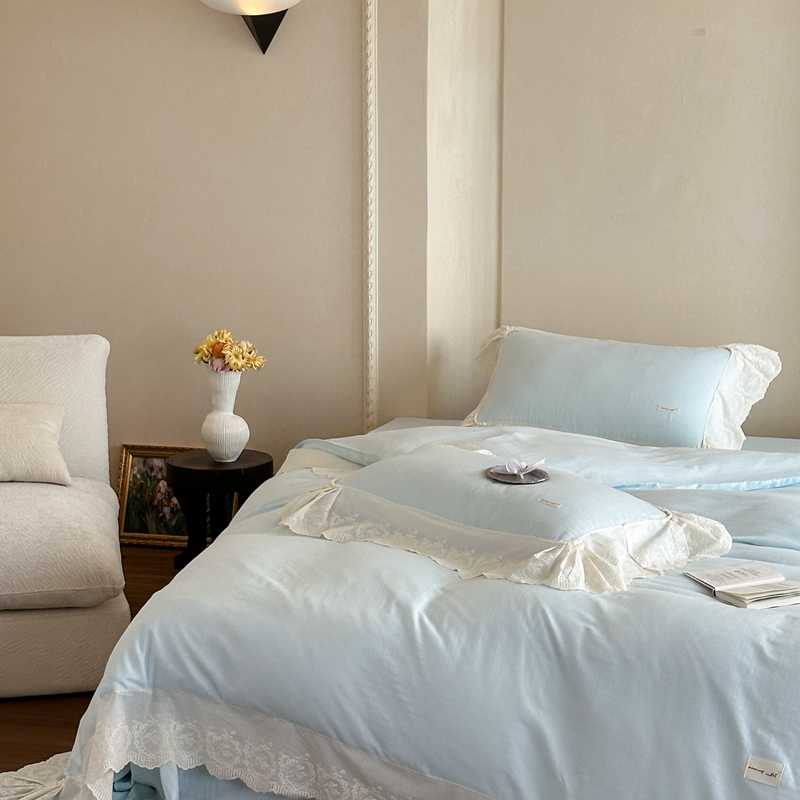 商品名称:小春日和 2025新款法式纯棉双层纱A类公主风四件套儿童婴幼儿被套纯色床单1.8床笠加大床单 碧落蓝