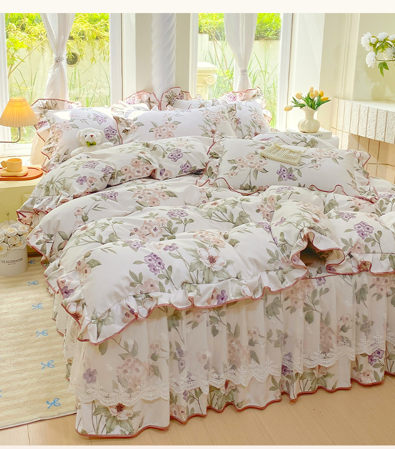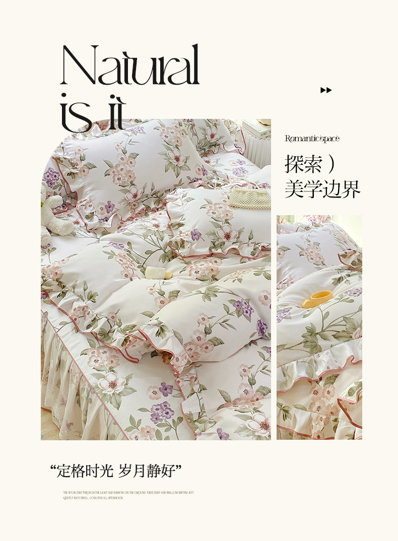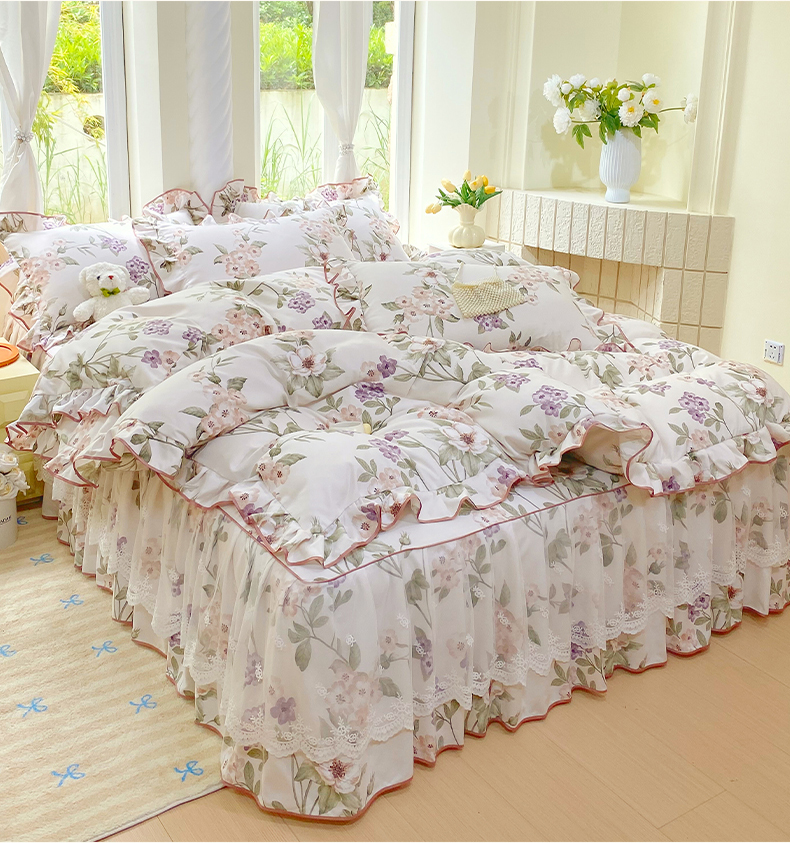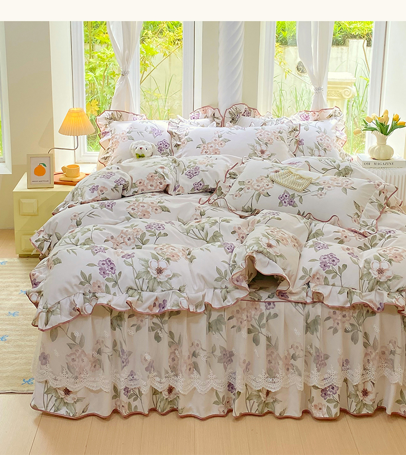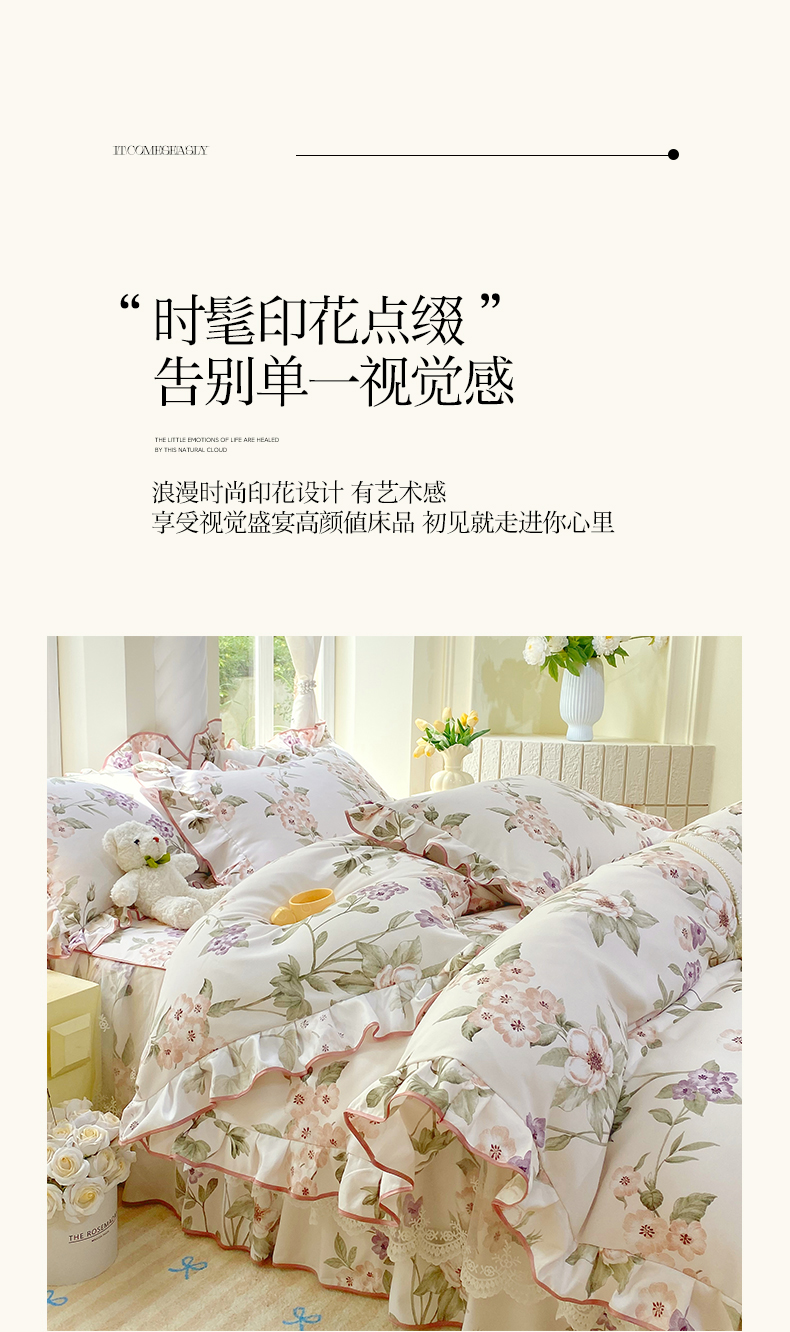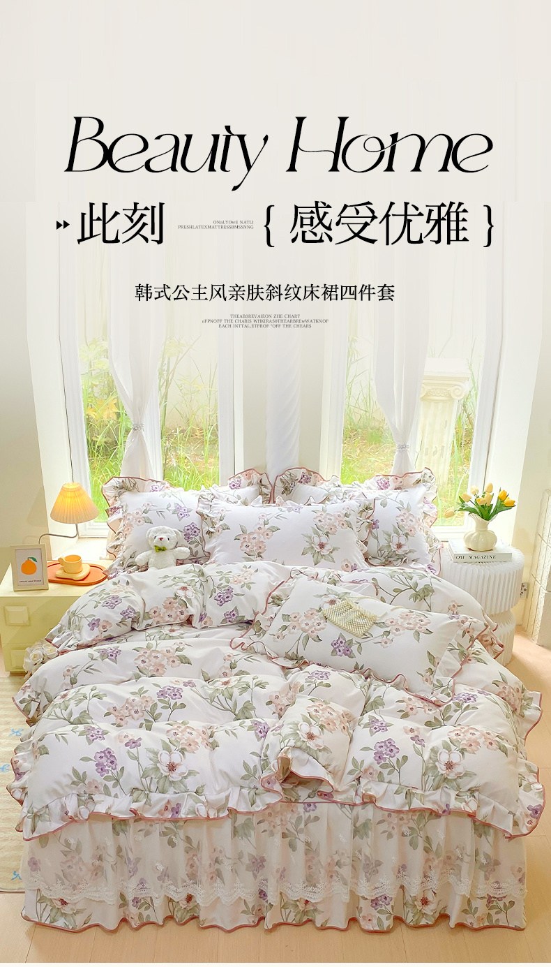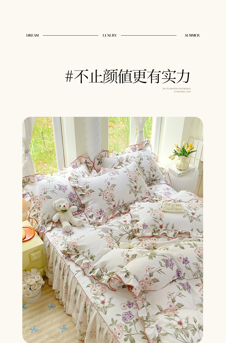 • 91家纺网 家纺一手货源 找家纺 雨彤家纺 2025新款高克重韩式公主风亲肤斜纹床裙四件套 望夏花艺-公主风