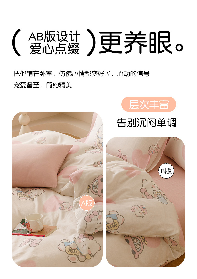 (总)瑞米家居 2024新款亲肤舒适A类双层纱四件套,草莓甜心,格子熊猫,花晨,花园小兔,绿意盎然,浅忆,苏夏,田园印象,甜蜜樱桃