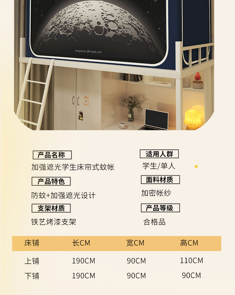 90上下铺通用(带靠墙帘):90宽x190长x90-120高(高度伸缩) | ¥105.00 |