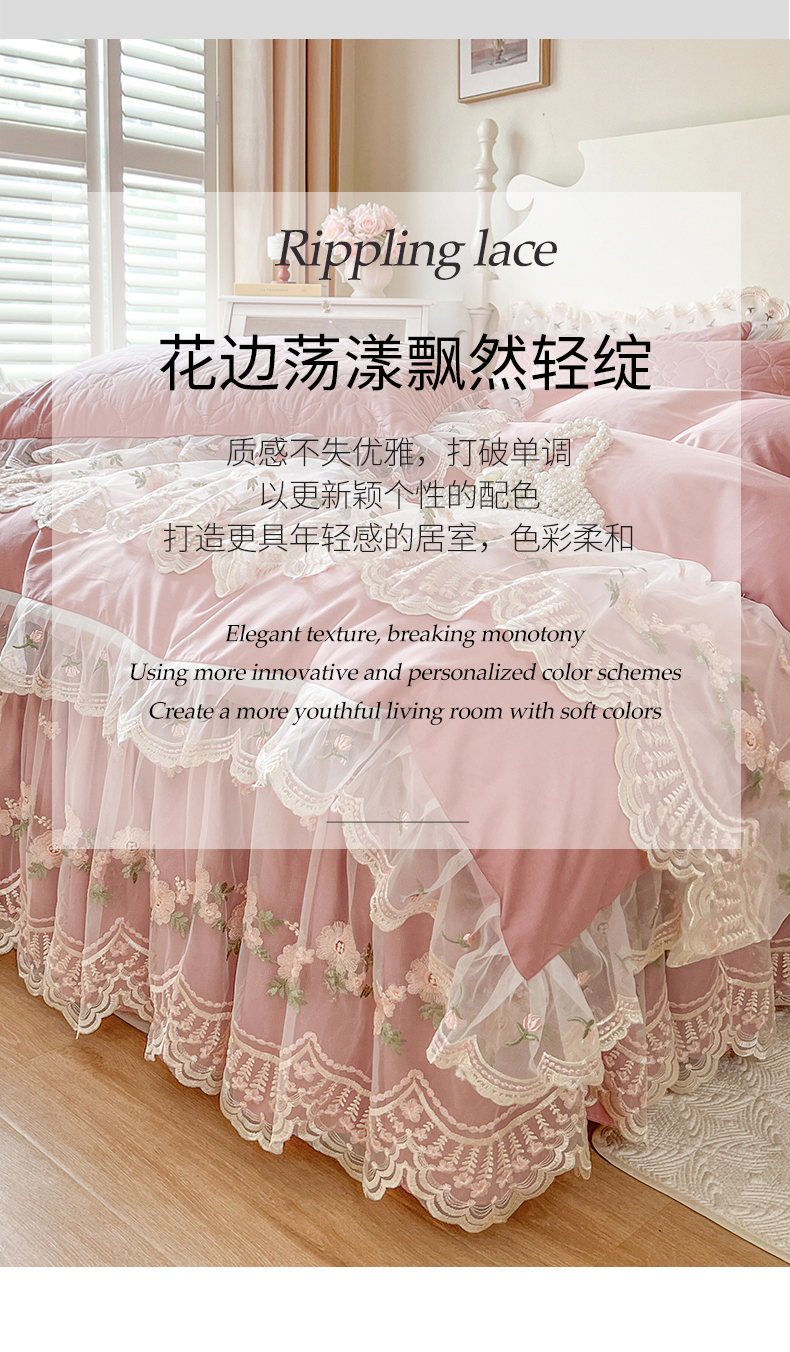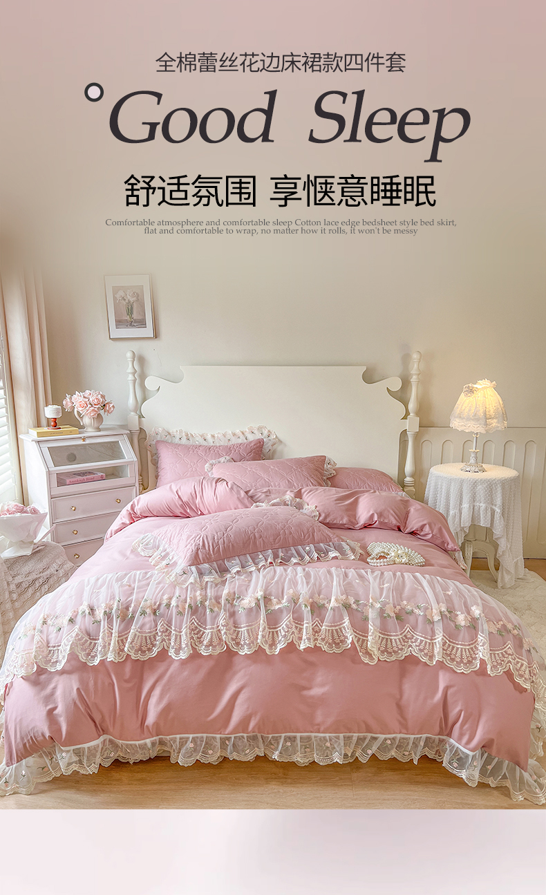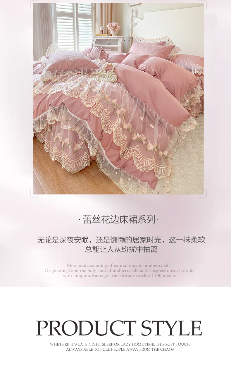 当前位置: 91家纺网 > 商品网购 > 床上用品 > 床裙 > 网红馆 2025新款蕾丝花边全棉床裙四件套晨暮花间系列 绯红
