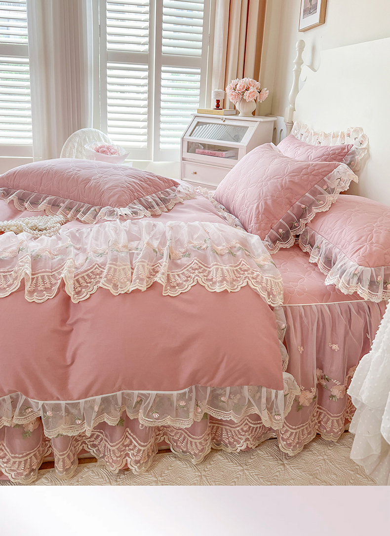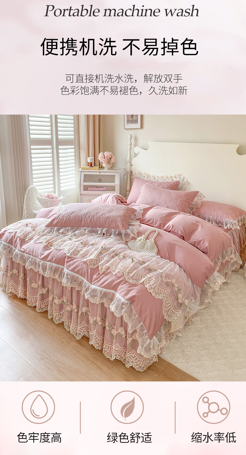 网红馆 2025新款蕾丝花边全棉床裙四件套晨暮花间系列 绯红