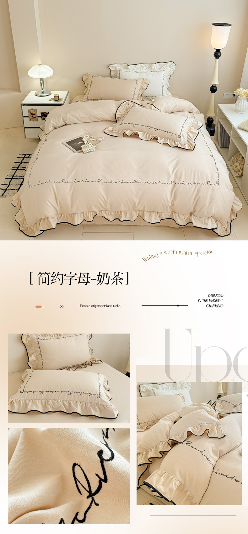 当前位置: 91家纺网 > 商品网购 > 床品套件 > 四件套 > 其它四件套 > 米可 2025新款云朵棉刺绣花边款四件套 简约字母-奶茶