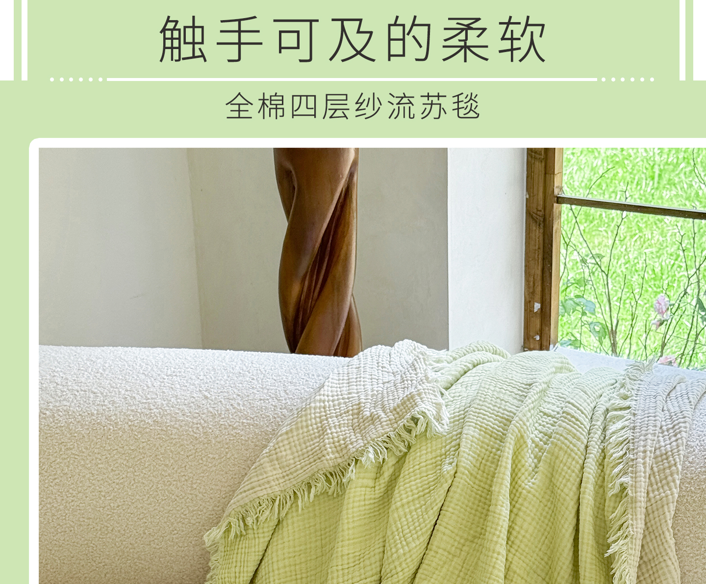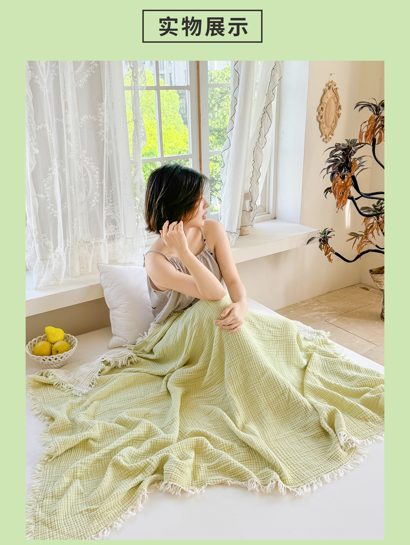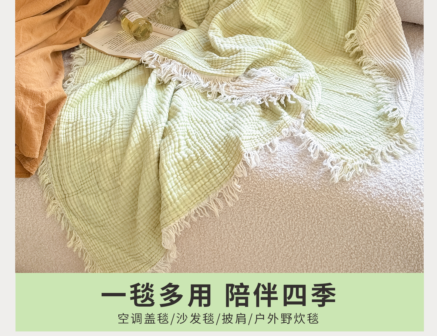 商品名称:佰亿莱2026新款全棉四层纱流苏毯纯棉夏被盖毯空调毯 浅绿色