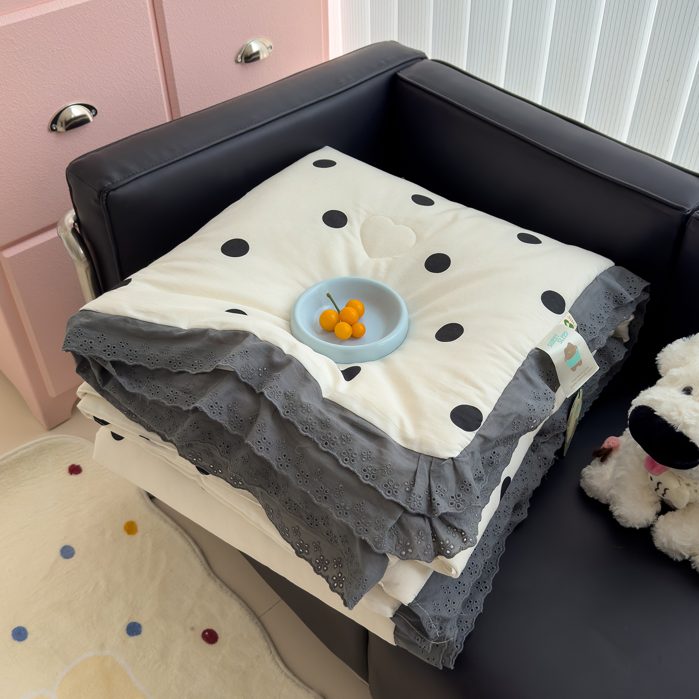 商品名称:赫梵茜 2025新款手工缝制踩棉纯棉韩系花边慵懒又高级双面纯棉印花春秋被被子被芯 腊肠伙伴