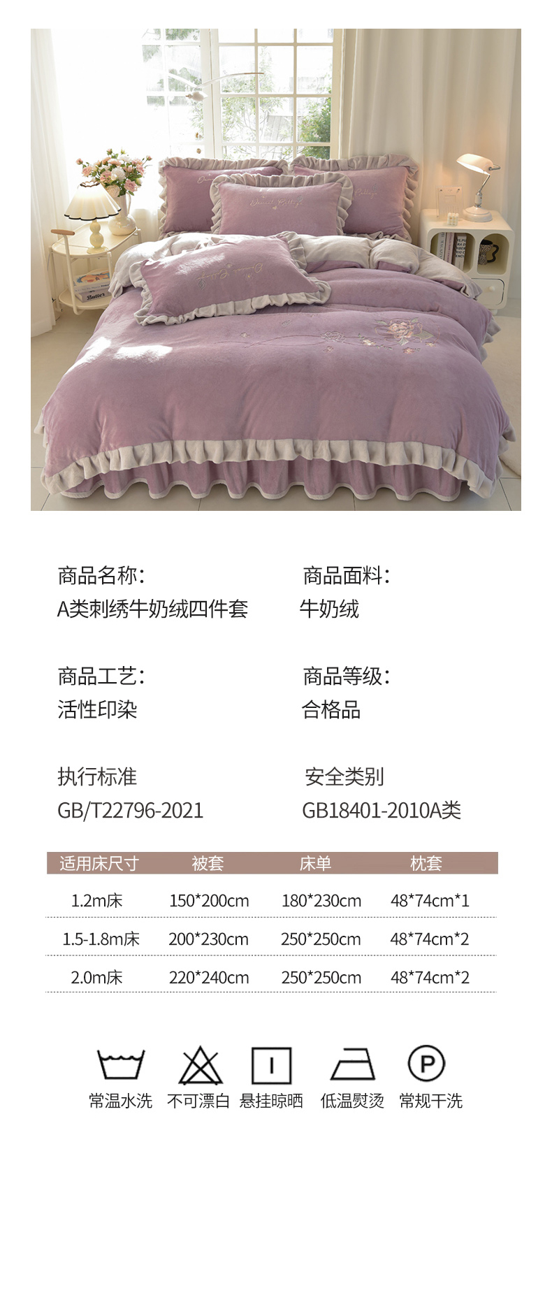 商品名称:鑫喜莱家纺 2025新款刺绣双层花边牛奶绒四件套(注意控价 标准尺寸156元,实际售价不得低于控价的价格) 花韵-丁香紫