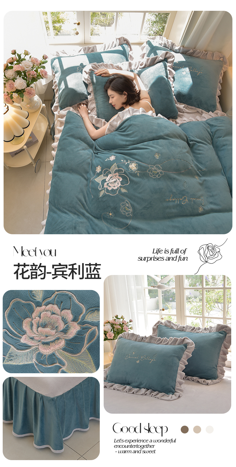 商品名称:鑫喜莱家纺 2025新款刺绣双层花边牛奶绒四件套(注意控价 标准尺寸156元,实际售价不得低于控价的价格) 清雅-暖玉