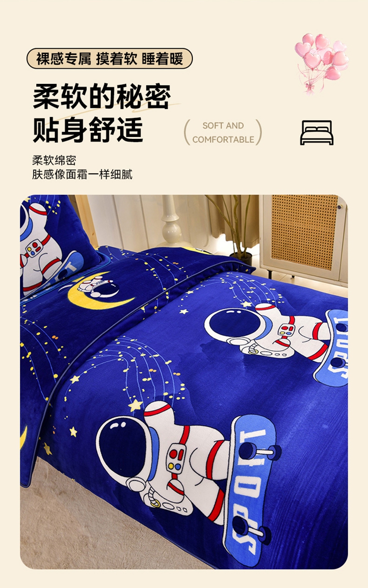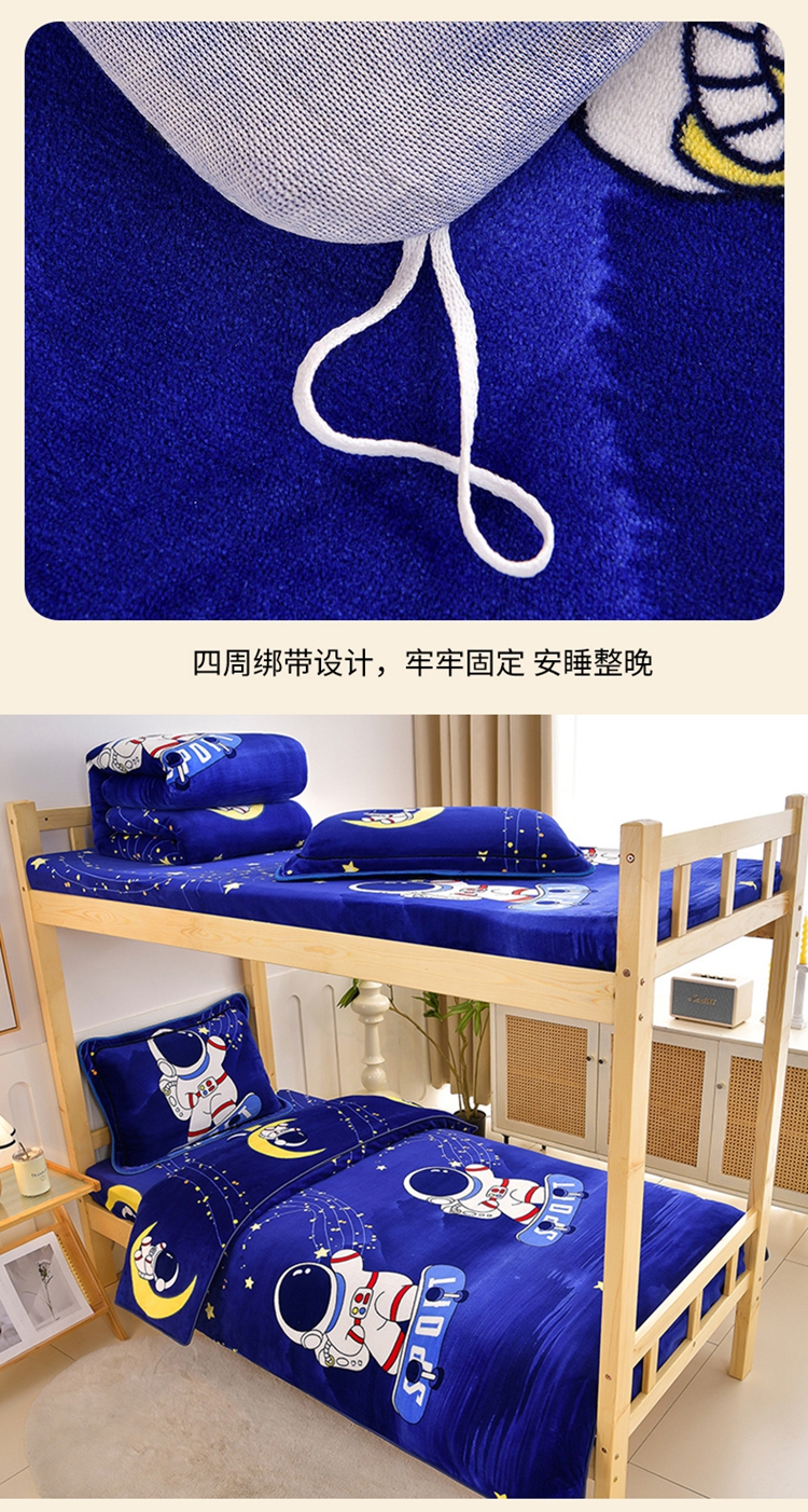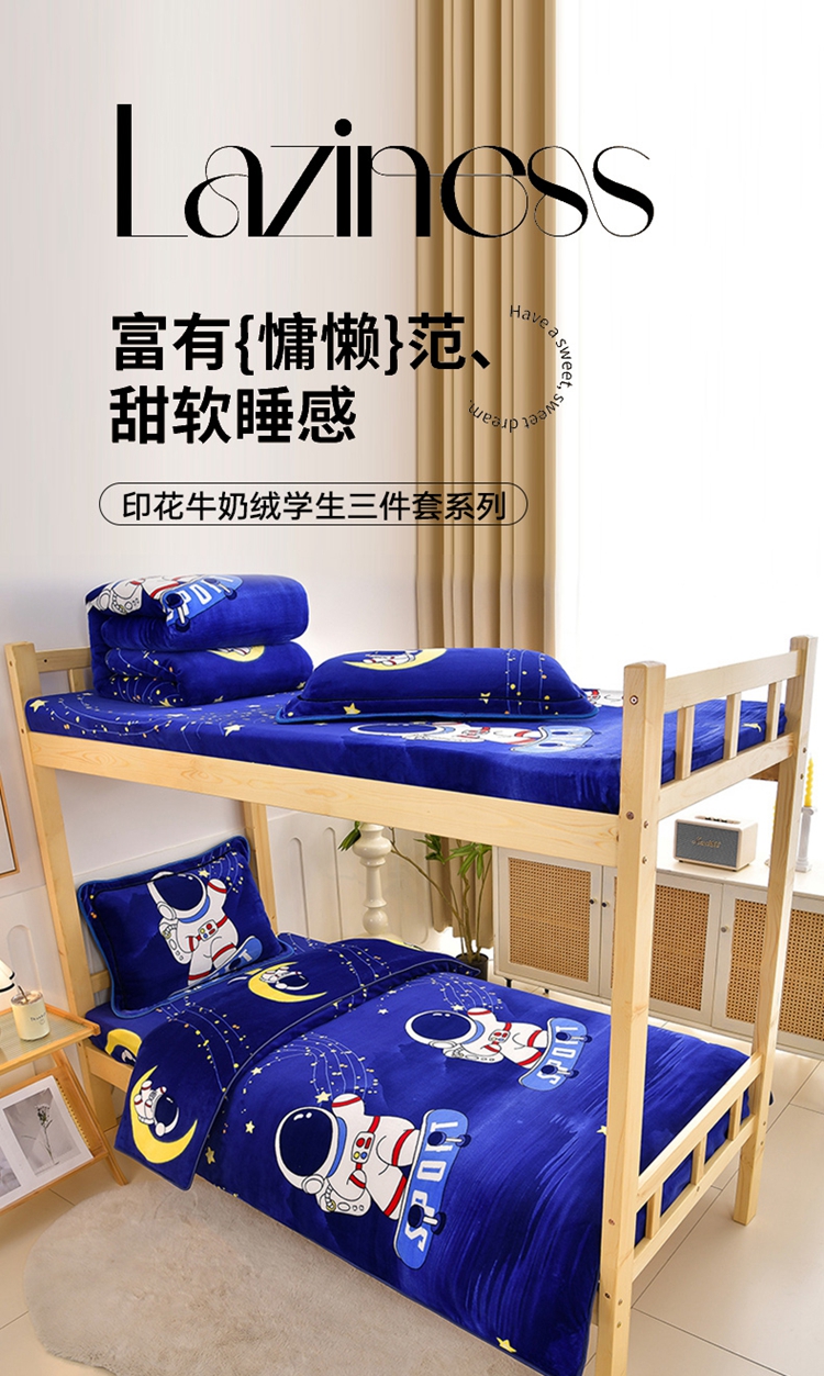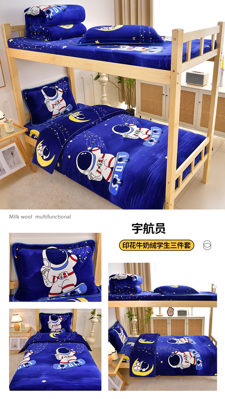 商品名称:馨梦缘2025新款爆款高克重印花牛奶绒法莱绒学生三件套 宇航员
