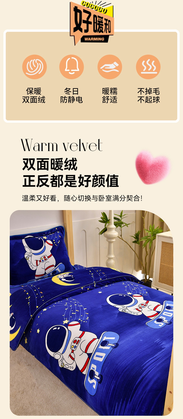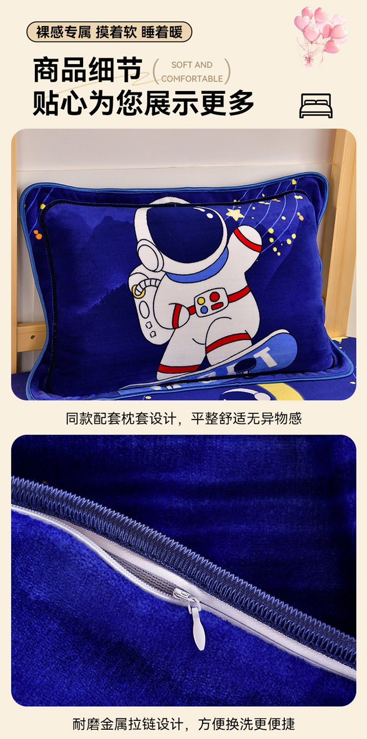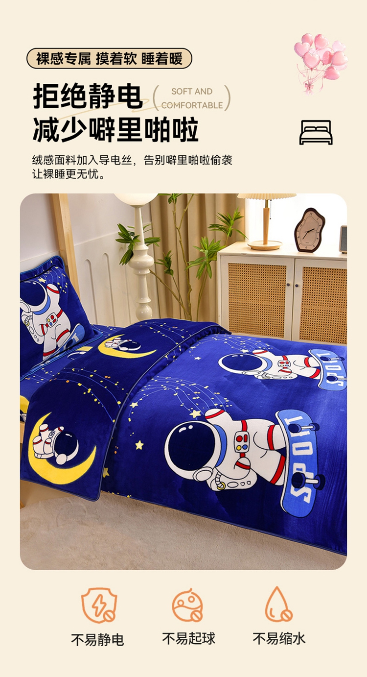 商品名称:馨梦缘2025新款爆款高克重印花牛奶绒法莱绒学生三件套 宇航员