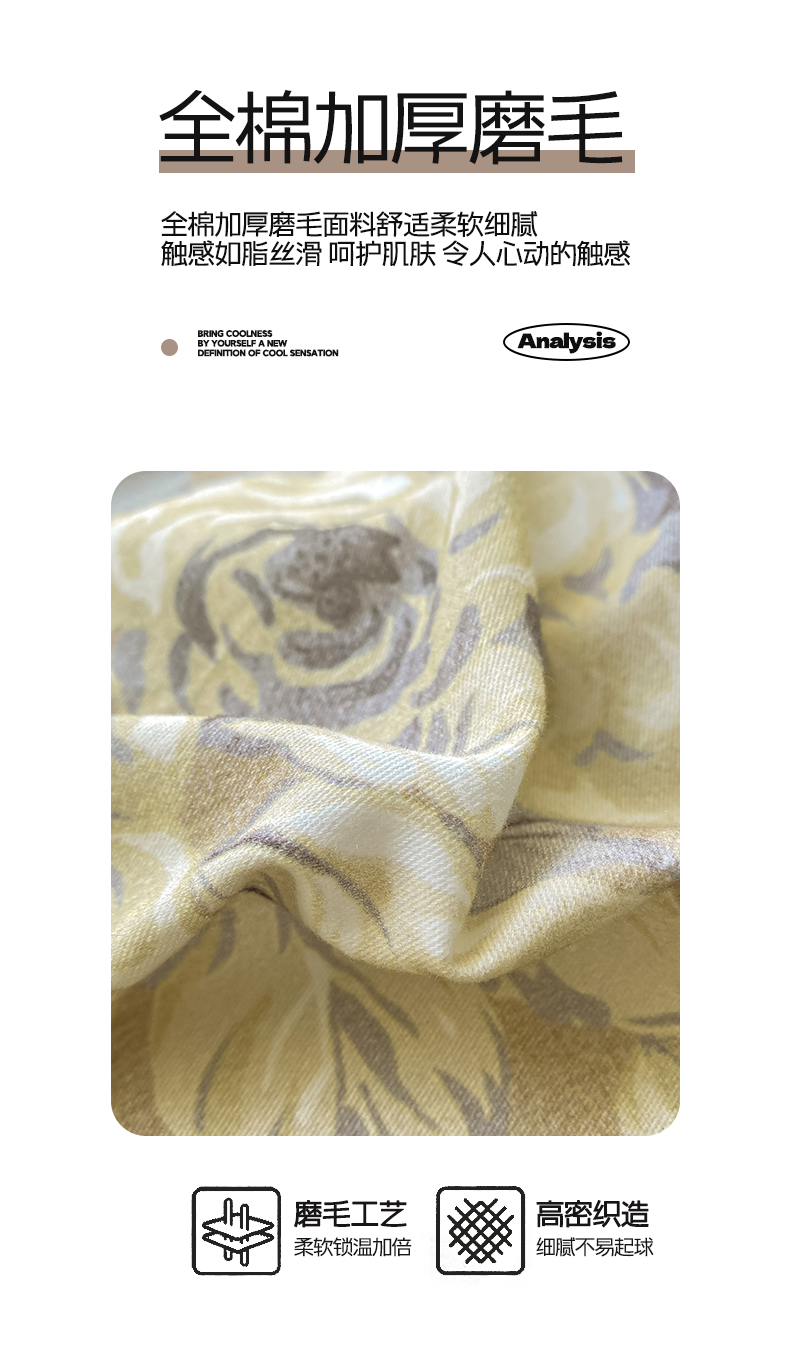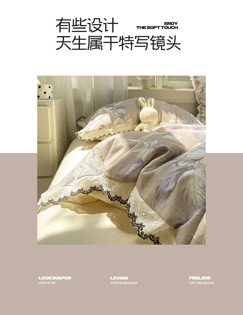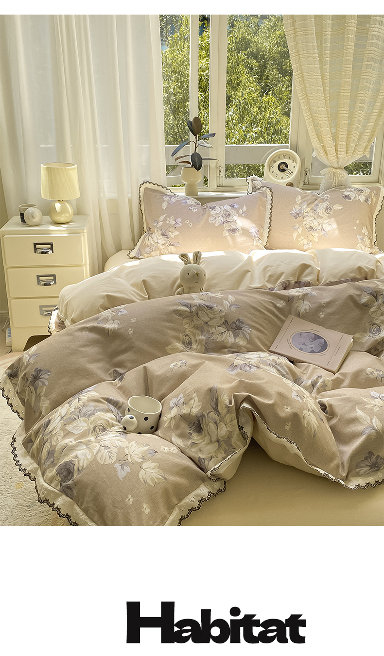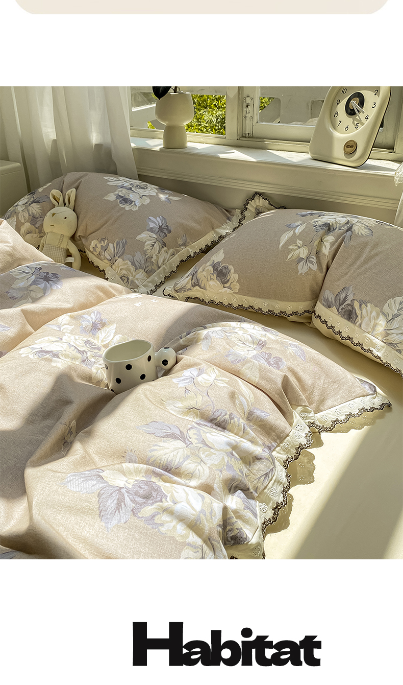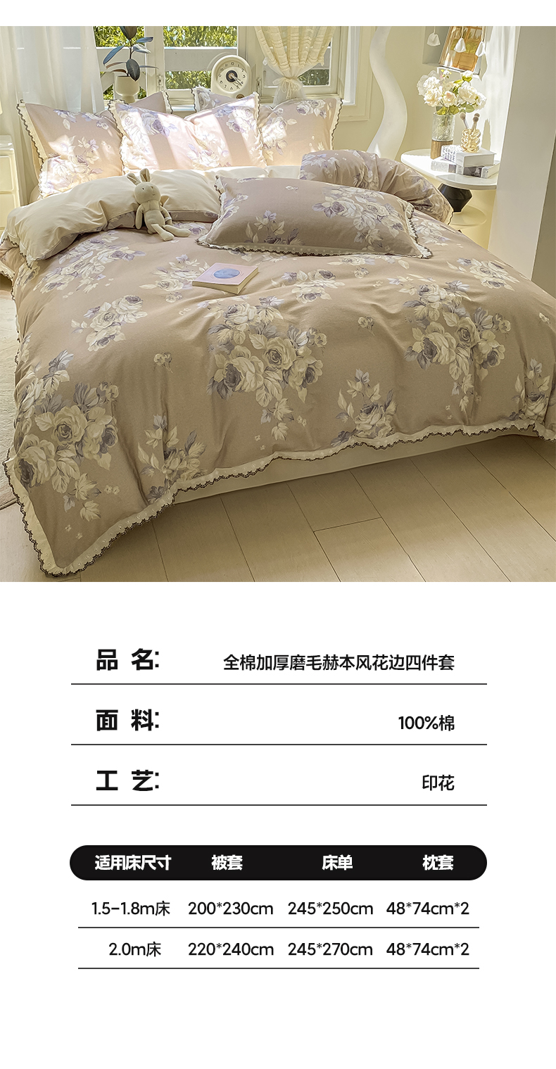 商品名称:宜家坊 2025新款全棉加厚赫本风花边磨毛四件套 花意浓-咖