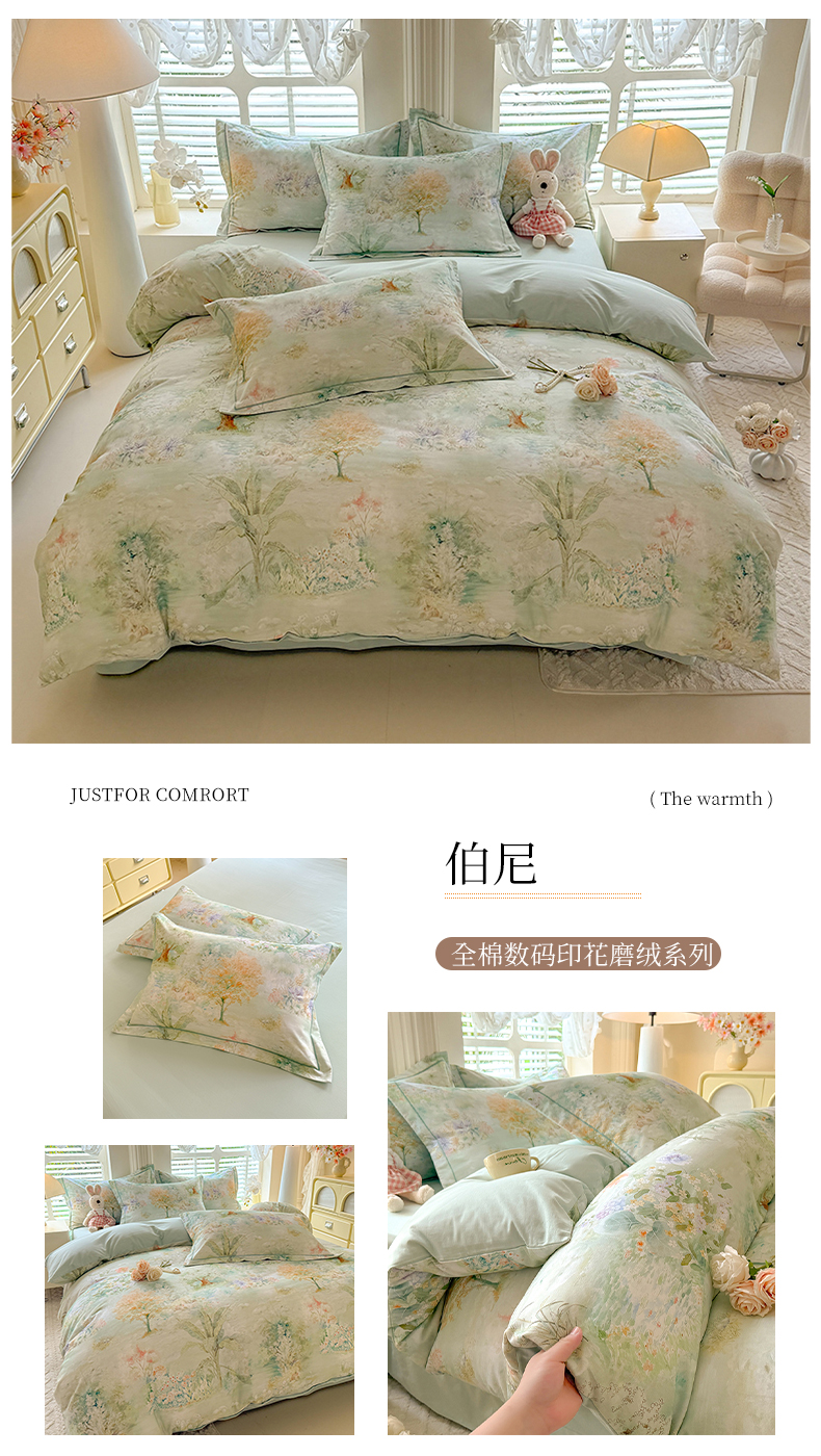 当前位置: 91家纺网 > 商品网购 > 床品套件 > 四件套 > 全棉普通四件套 > 巧玲珑 2025新款100%数码印花生态AB版四件套 伯尼