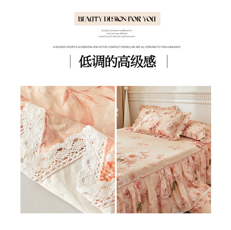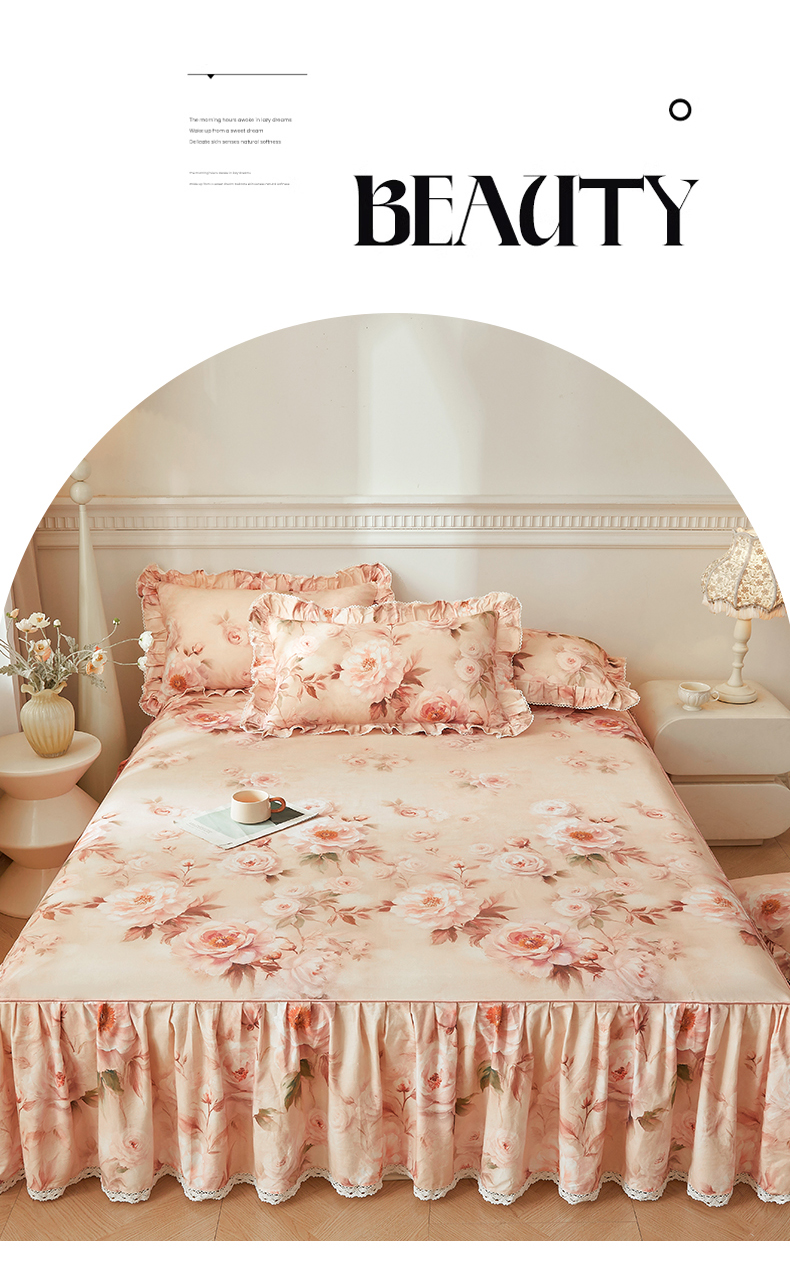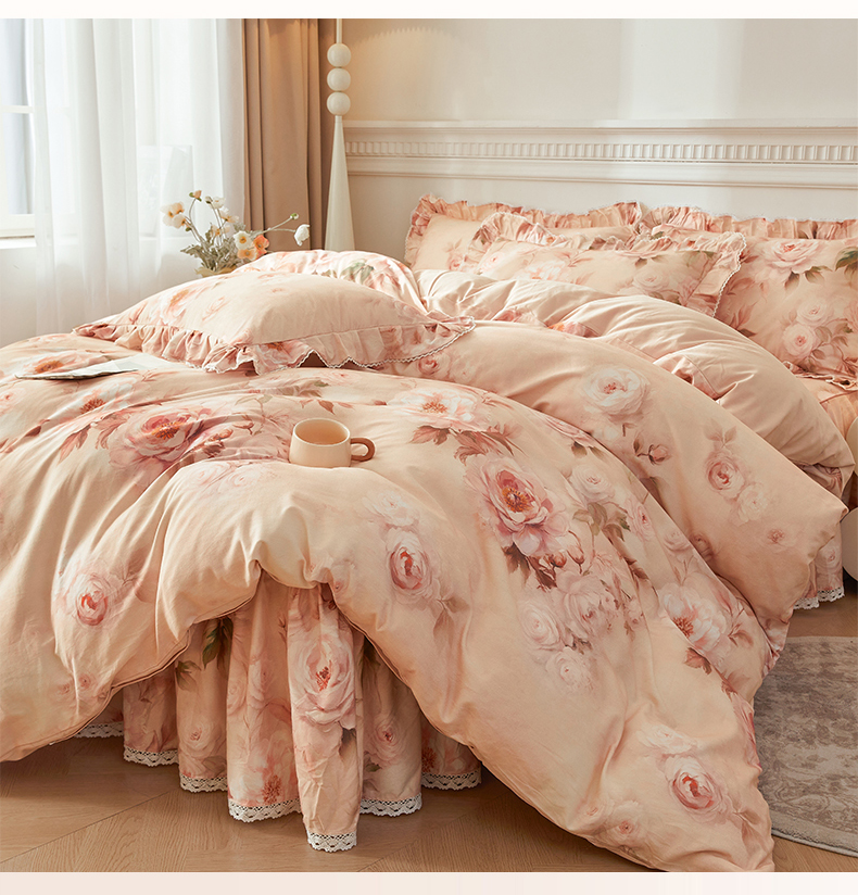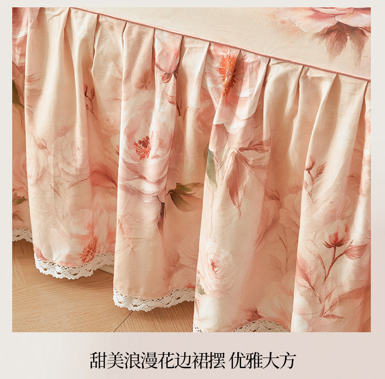 当前位置: 91家纺网 > 商品网购 > 床品套件 > 四件套 > 全棉普通四件套 > 缦彩 2025新款100%全棉A类数码印花床裙遮丑花边床单床罩四件套 成瑾-粉