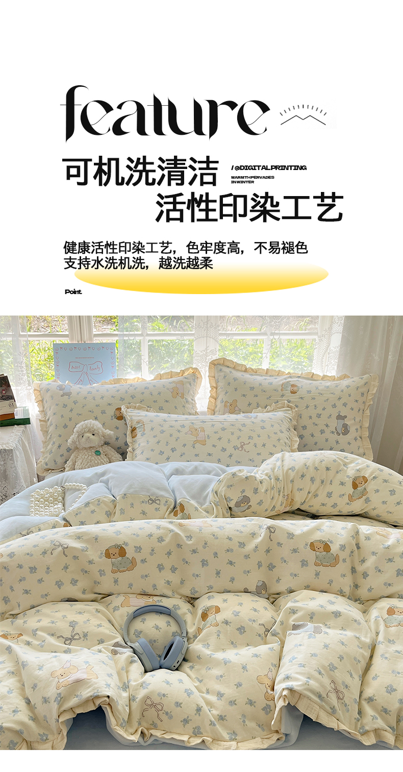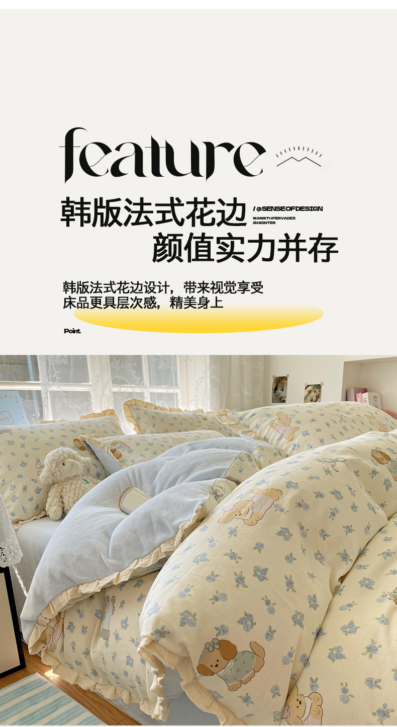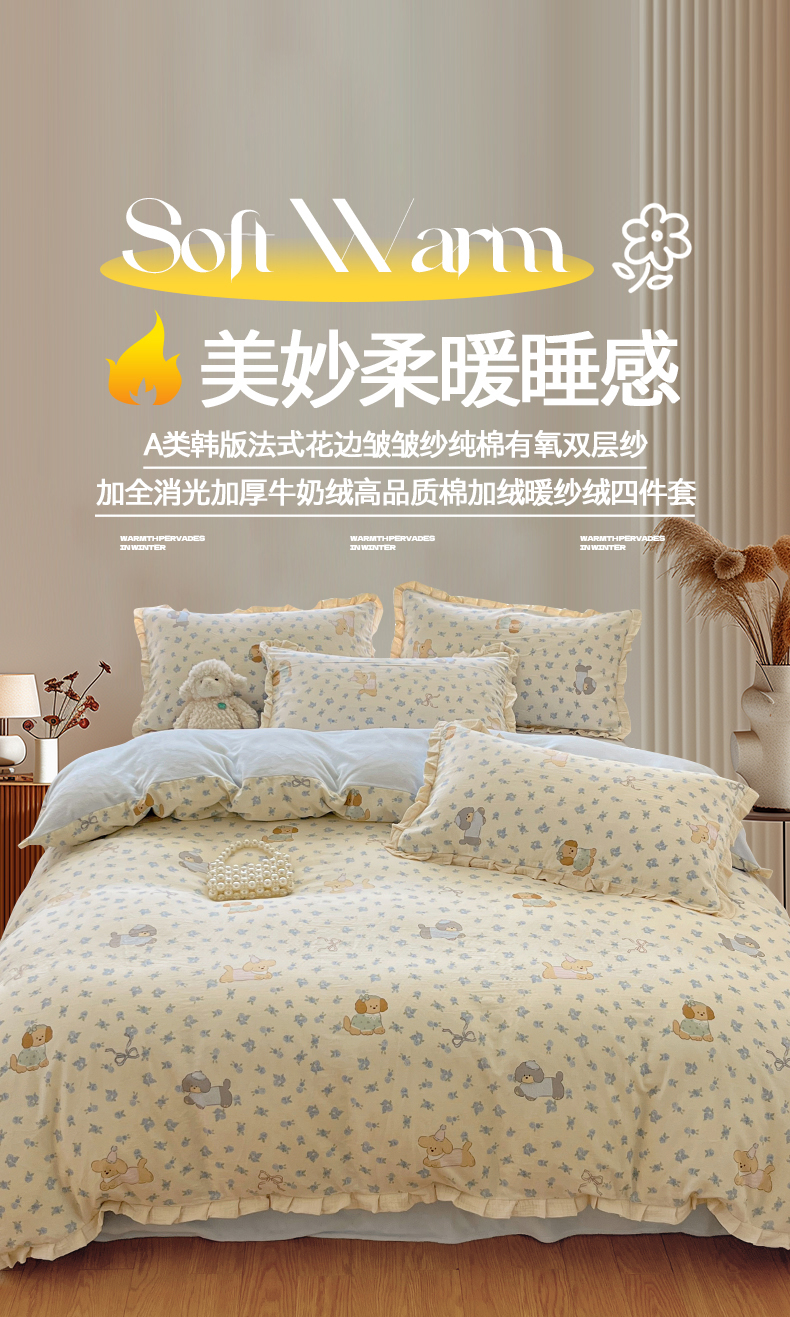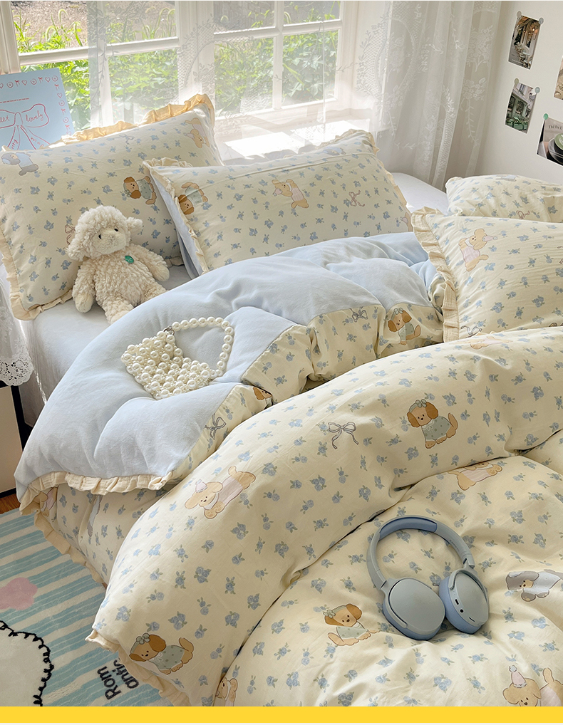 商品名称:桃子家居 2025新款A类韩版花边皱皱纱纯棉有氧双层纱加全消光加厚牛奶绒高品质棉加绒暖纱绒四件套 暖纱绒-蓝花小狗