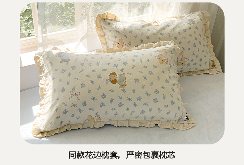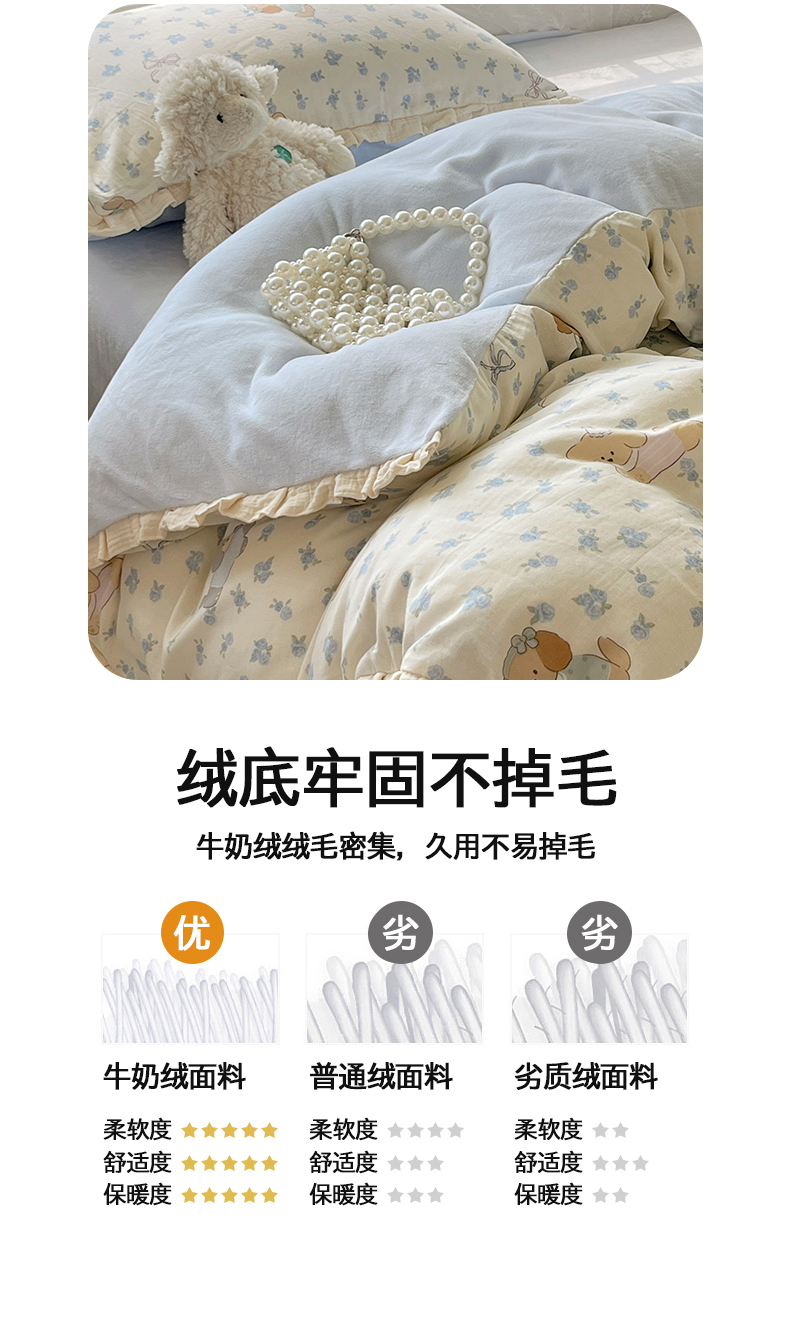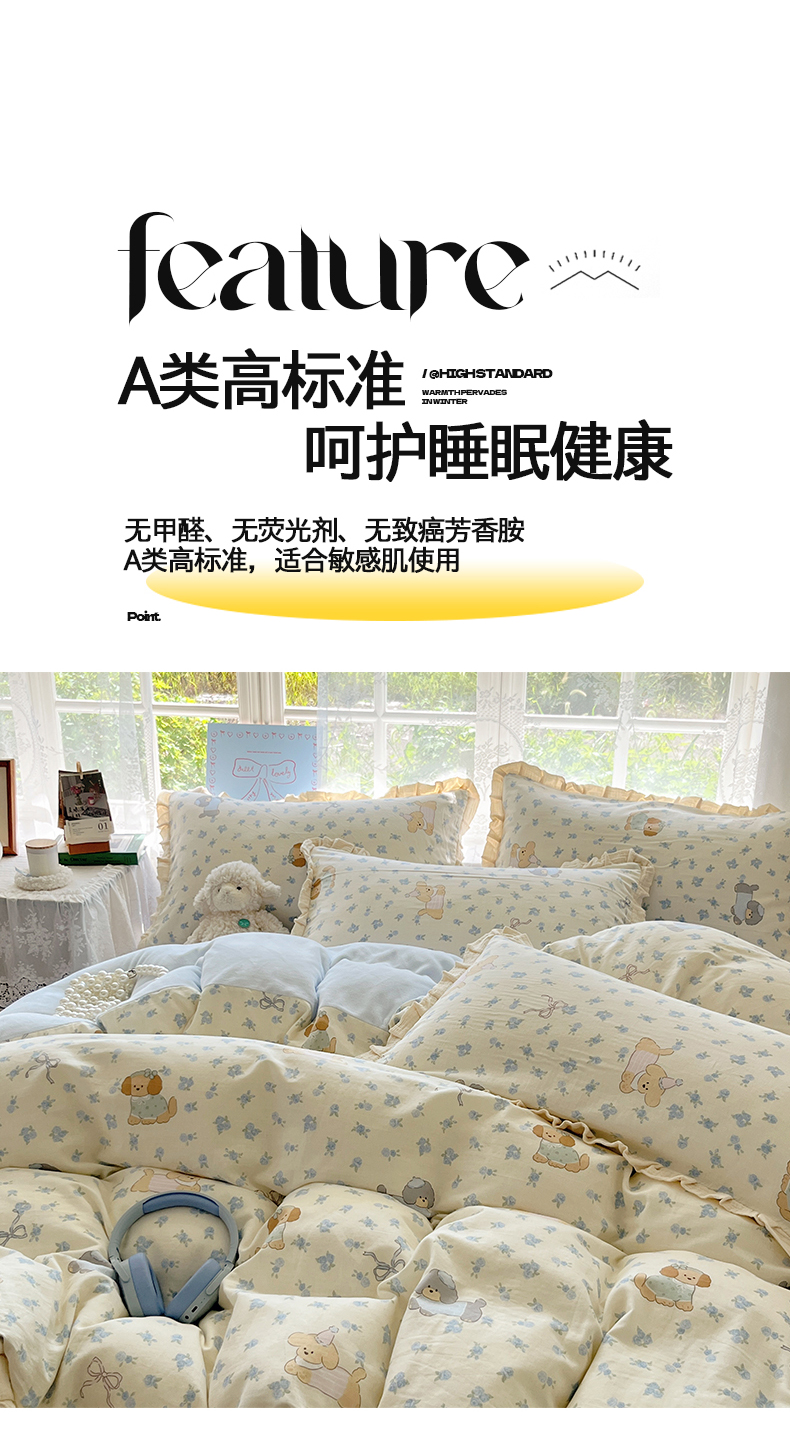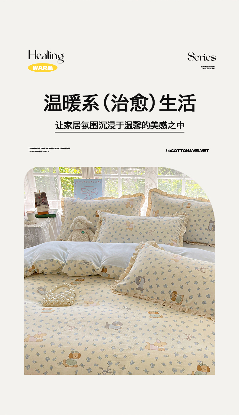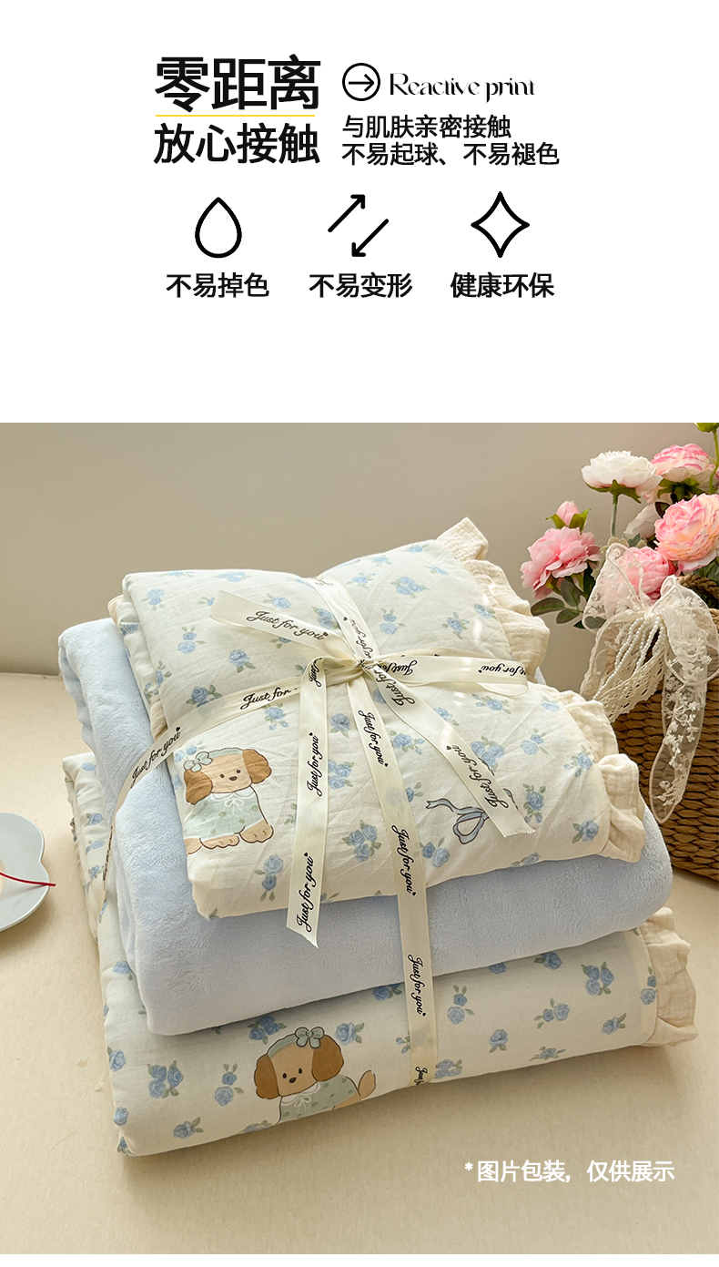 商品名称:桃子家居 2025新款A类韩版花边皱皱纱纯棉有氧双层纱加全消光加厚牛奶绒高品质棉加绒暖纱绒四件套 暖纱绒-蓝花小狗