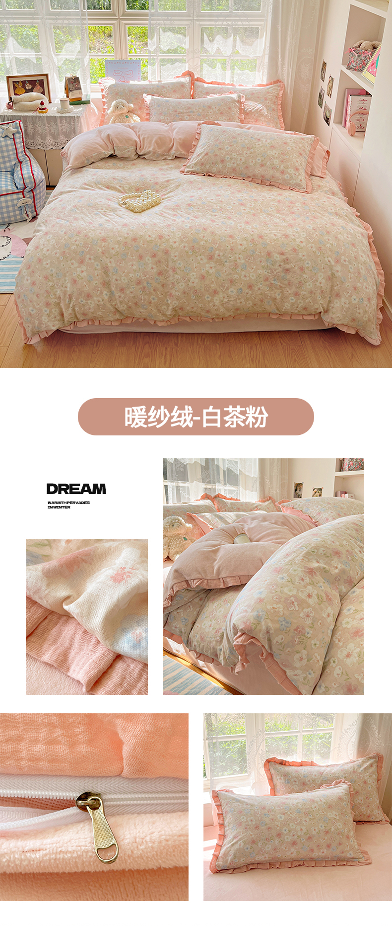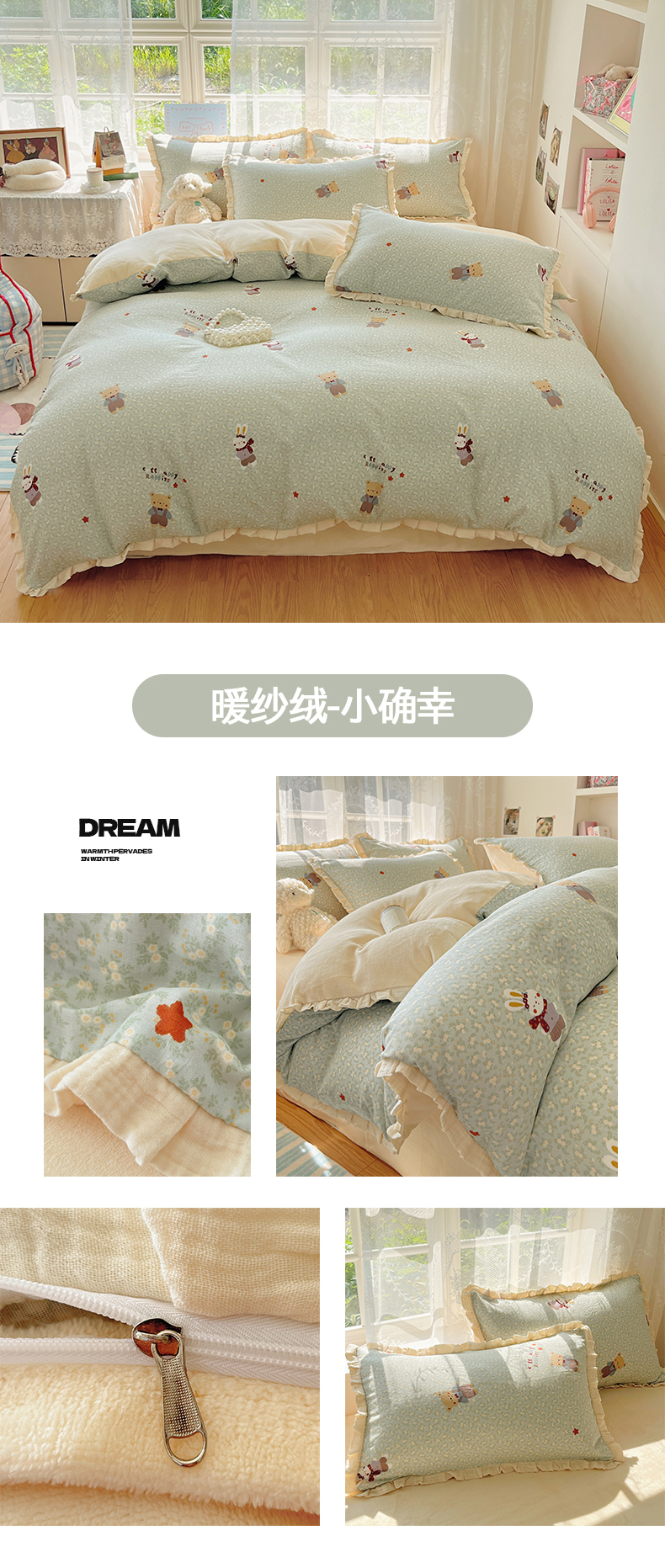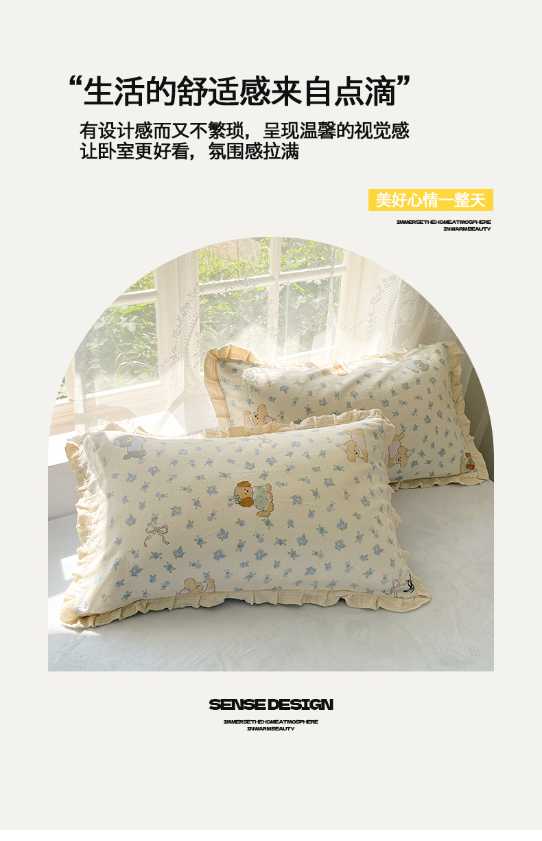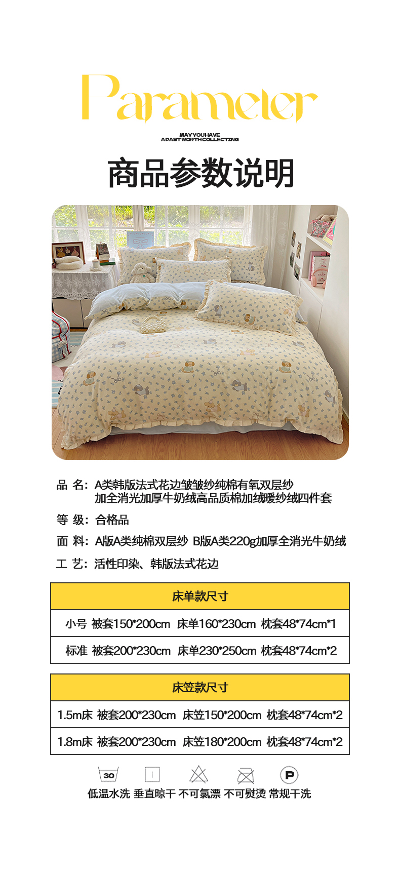 商品名称:桃子家居 2025新款A类韩版花边皱皱纱纯棉有氧双层纱加全消光加厚牛奶绒高品质棉加绒暖纱绒四件套 暖纱绒-蓝花小狗