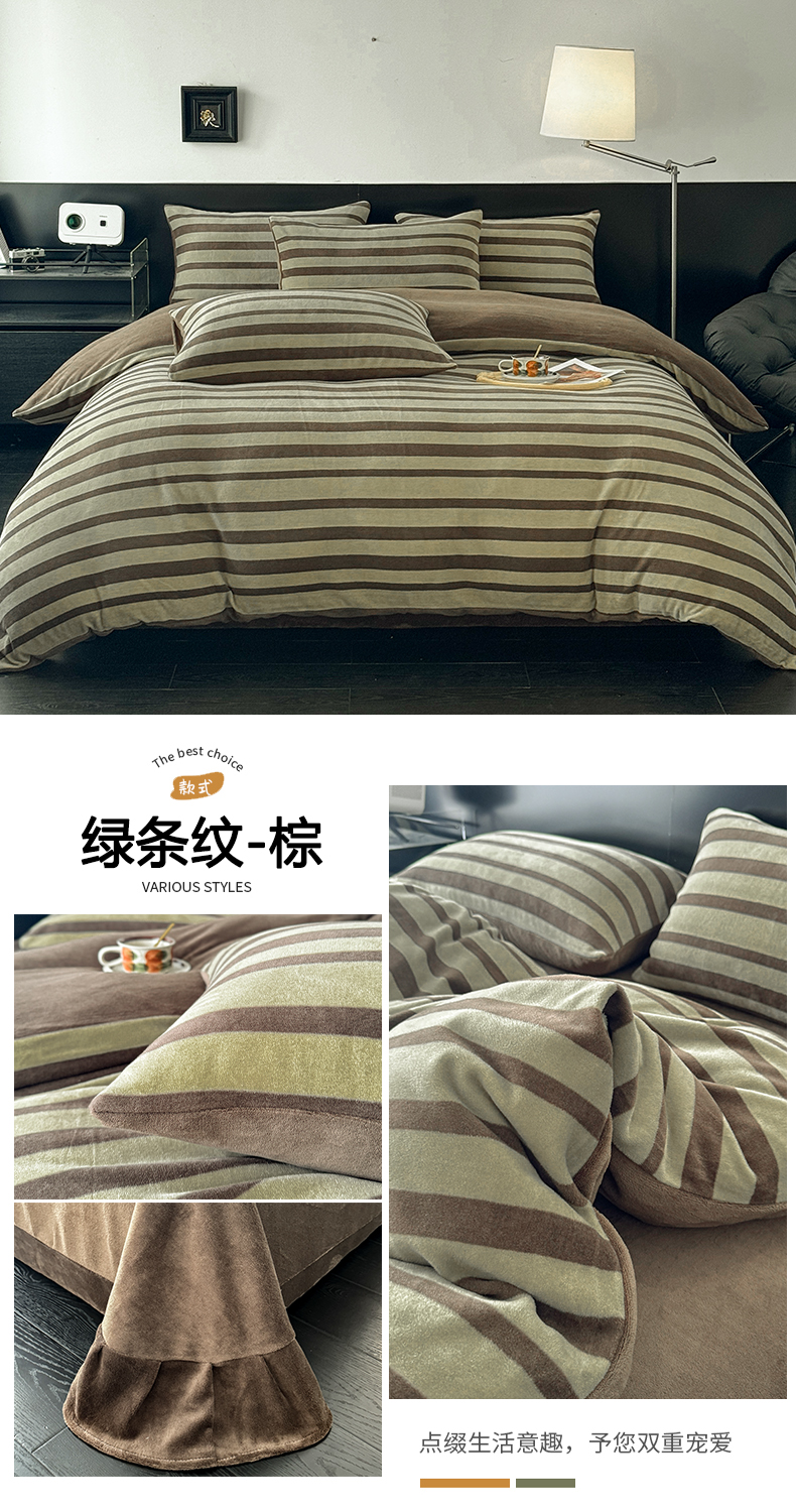 商品名称:子曰 2025新款A类高克重蒂肤绒羊绒保暖印花四件套 绿条纹-棕